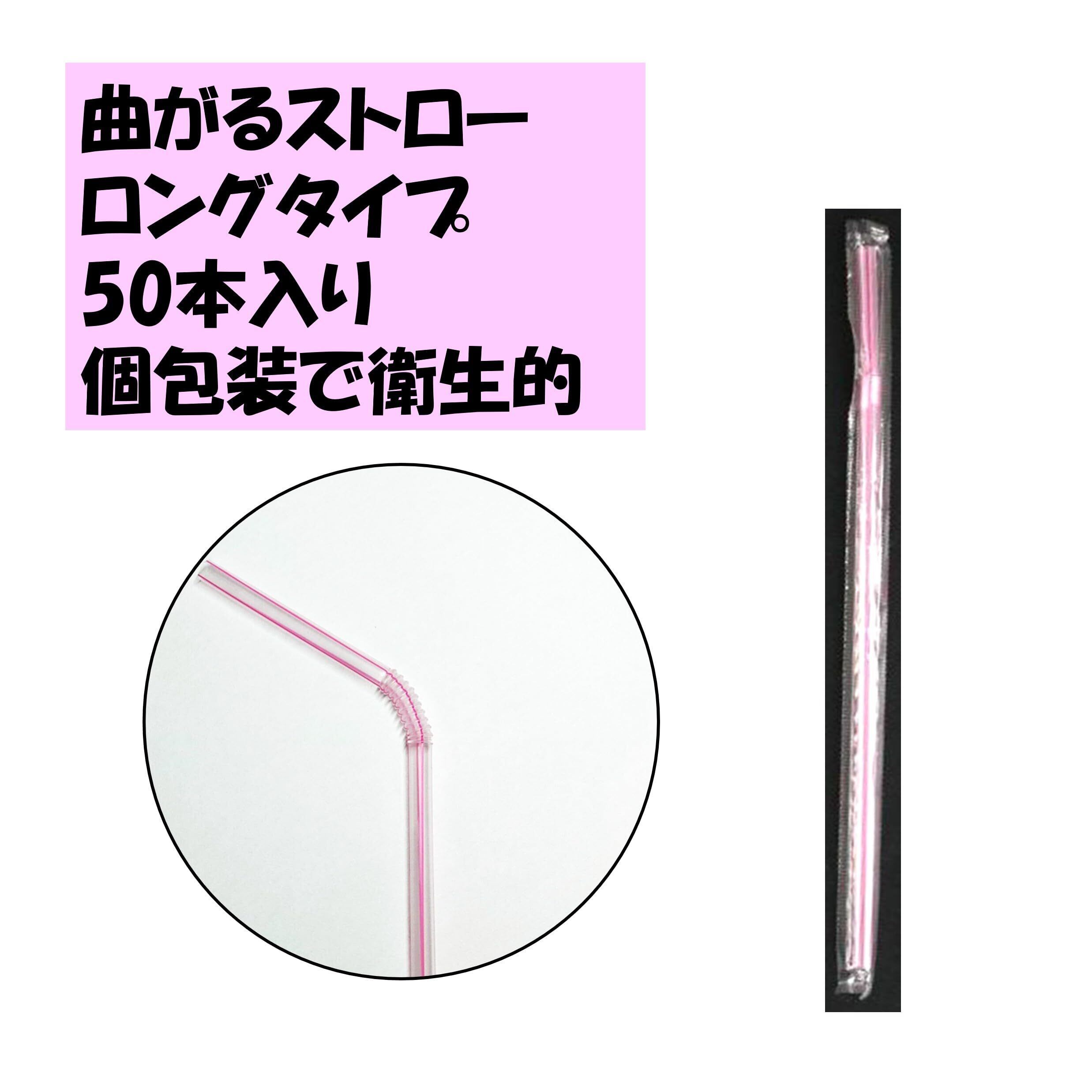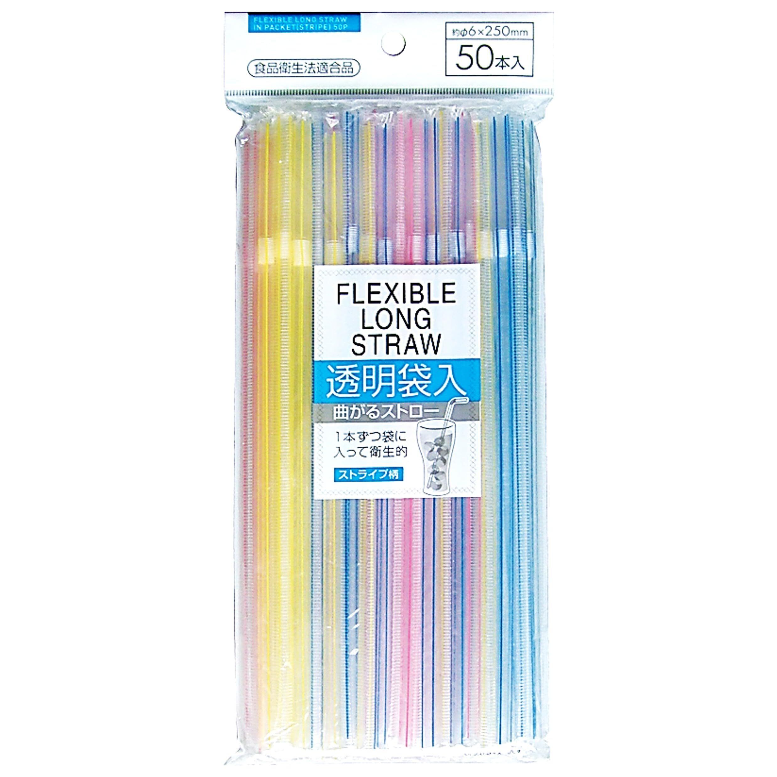 曲がるストロー ストライプ柄 ロング 50本入 6×250mm 個包装 透明袋入り 500mlペットボトル対応 食品衛生法適合品 ストロー