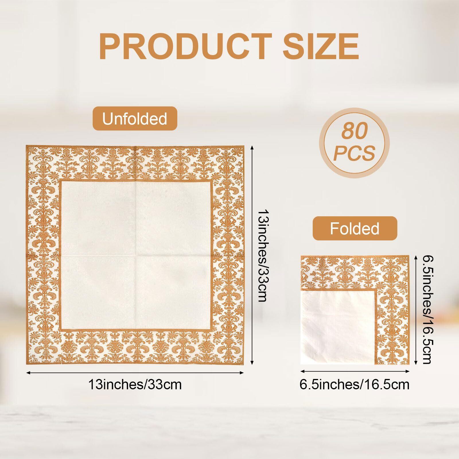 【紙ナプキンのサイズ】広げた状態の使い捨てナプキンのサイズは約33x33cm/13x13インチ、折りたたんだ状態の金色のプリントナプキンのサイズは約16.5x16.5cm/6.5x6.5インチです。