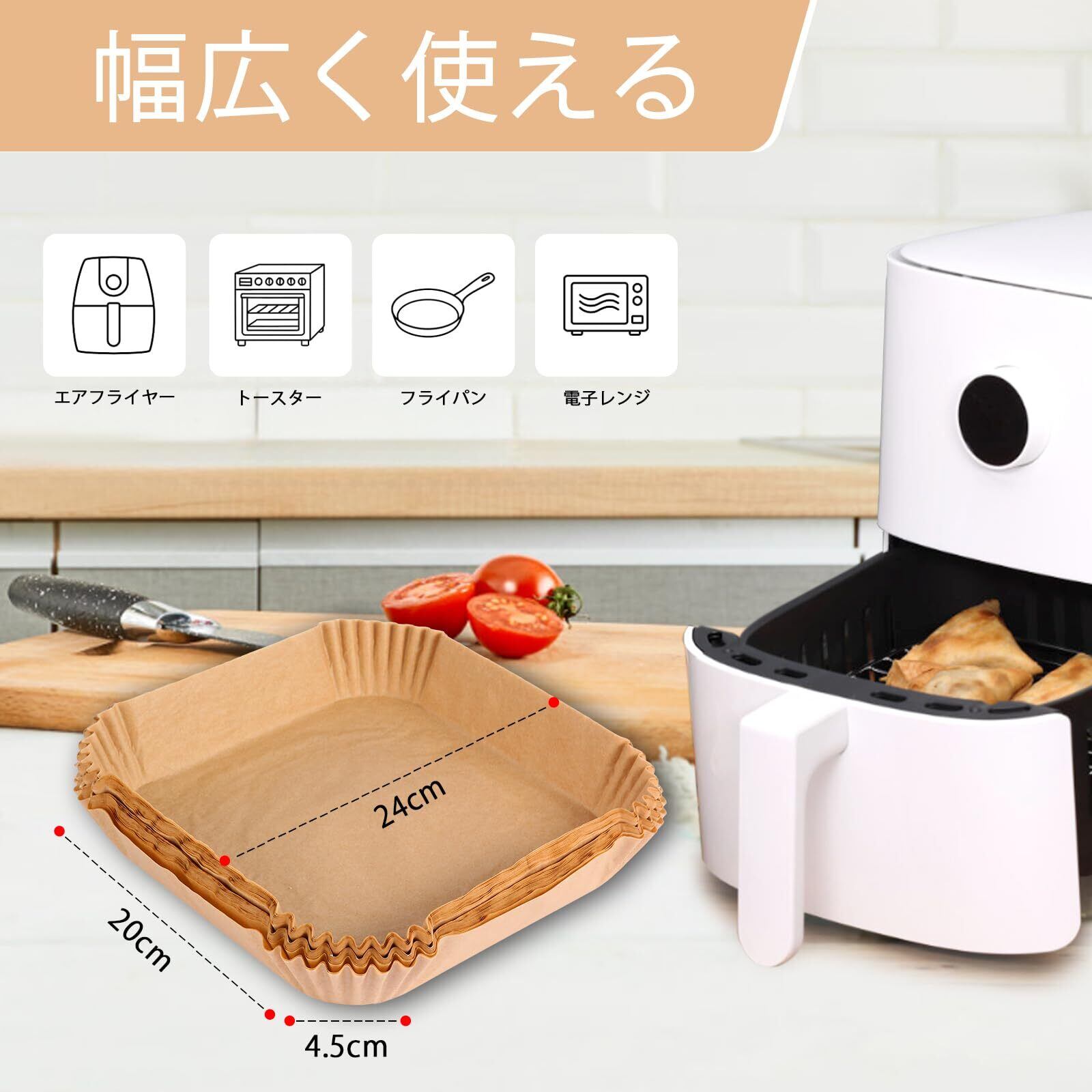 【使い捨てタイプで片付けがラクラク】:料理後はそのまま捨てるだけでOK。高さ4.5cmのデザインで、エアフライヤーの側面までしっかりカバーし、油跳ねや焦げ付きも防止。お手入れの手間を大幅に軽減します。