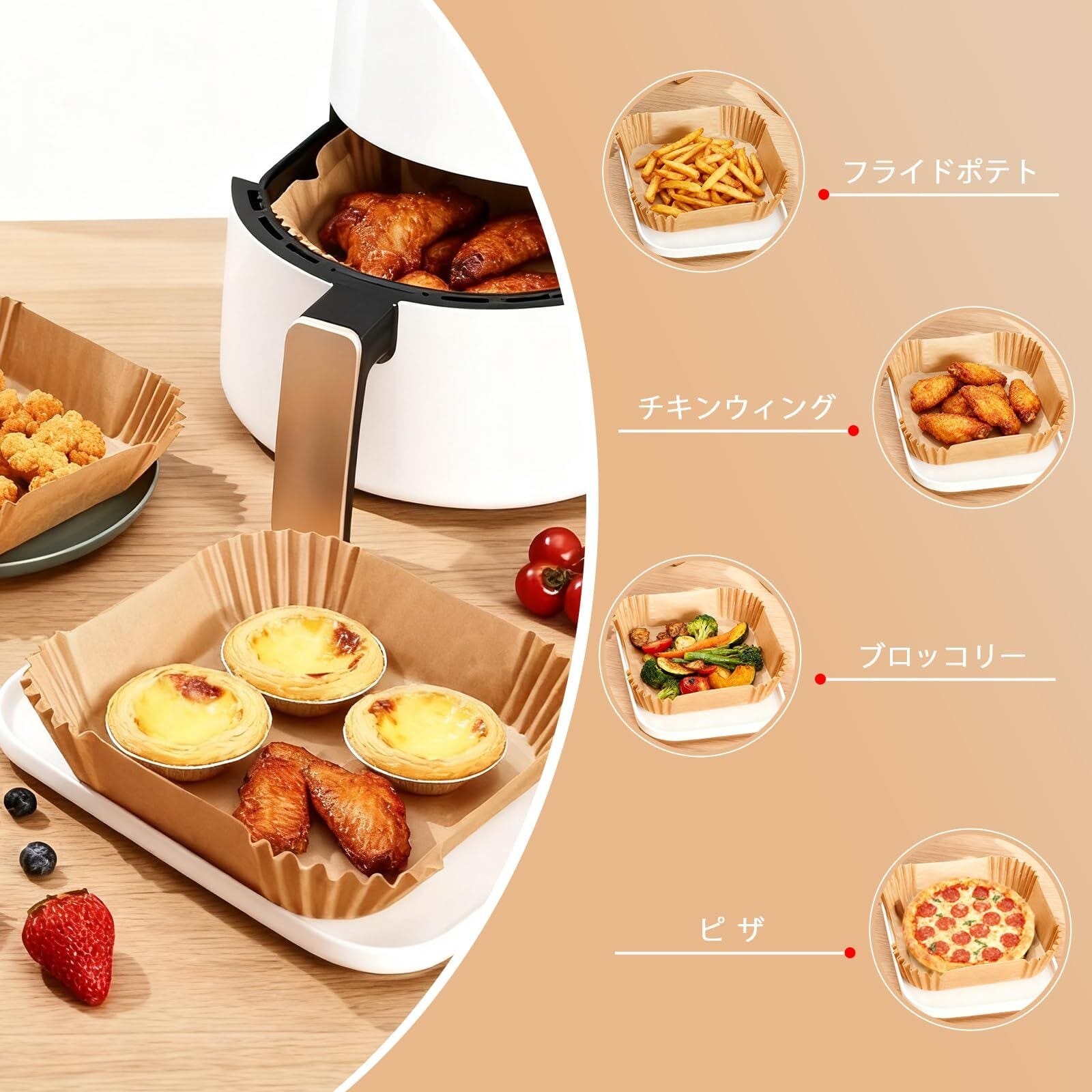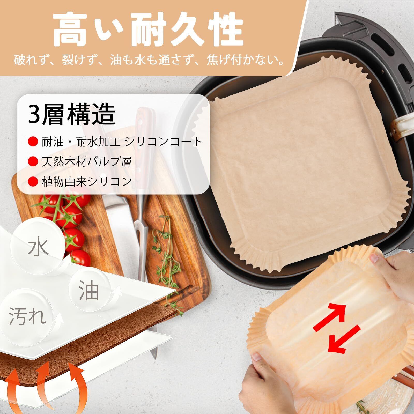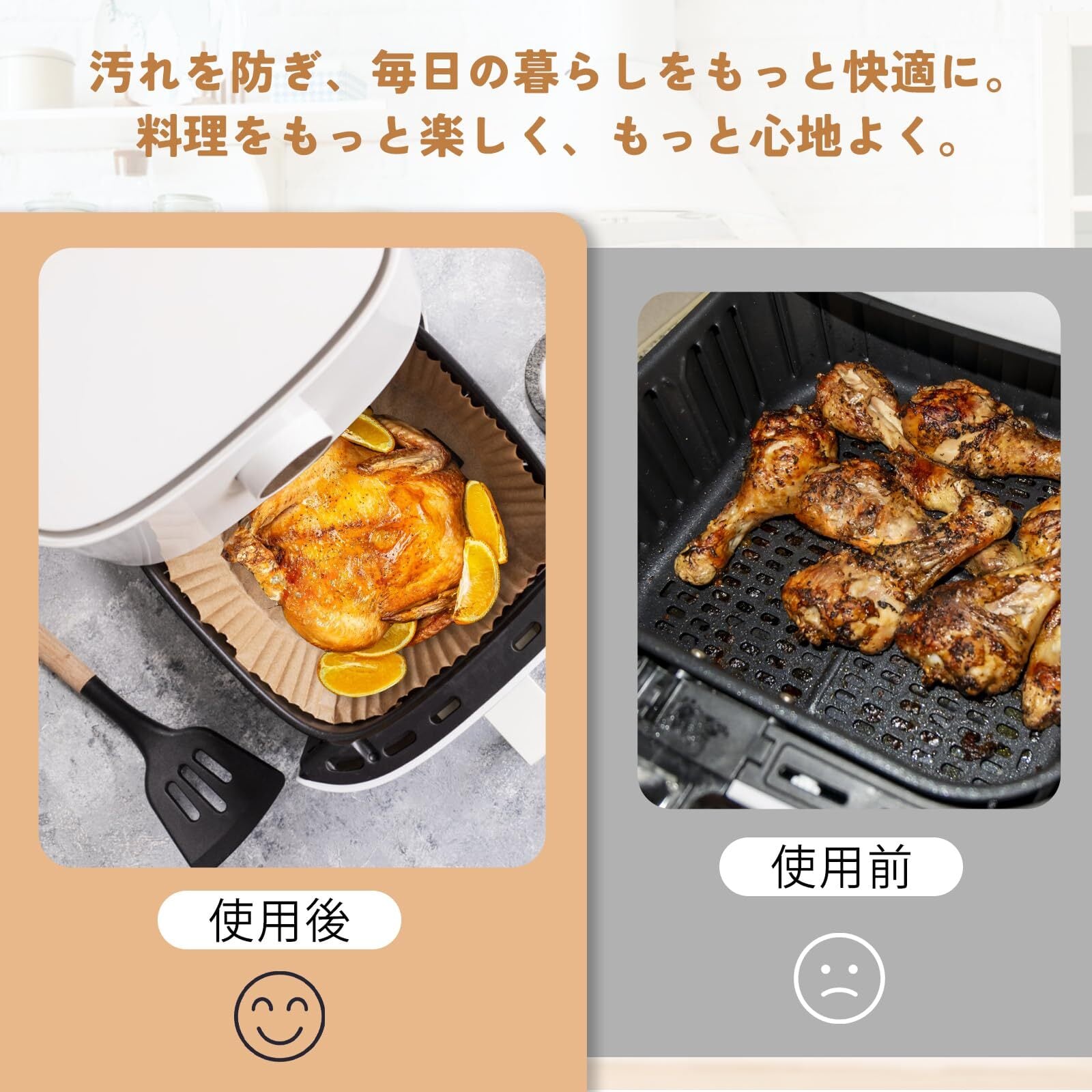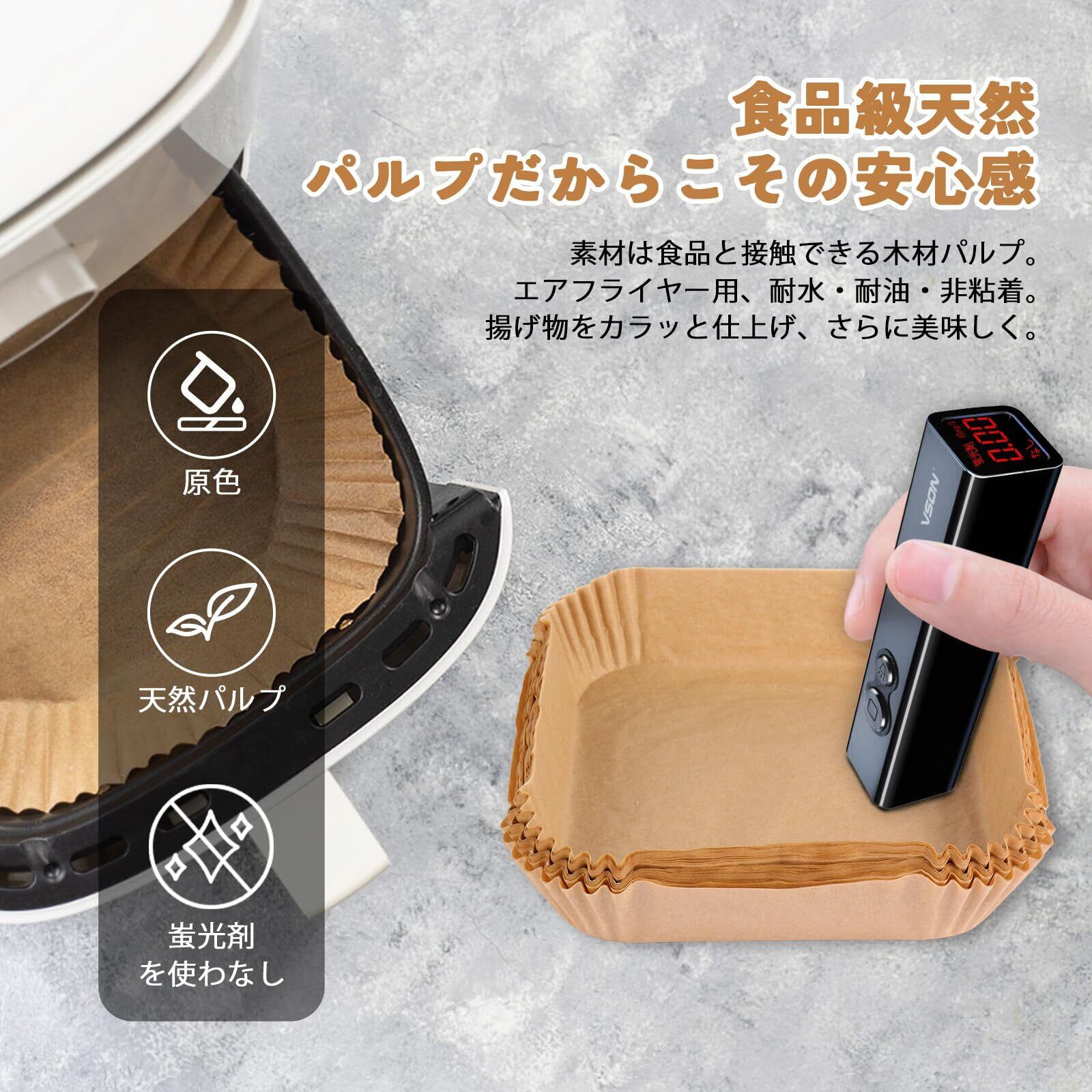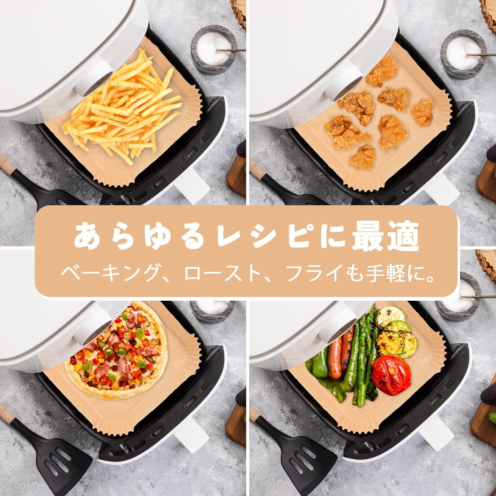 【安心して使える使用上の注意】:空のまま予熱しないでください。エアフライヤー 紙は必ず十分な量の食材と一緒に使用してください(シートの2/3以上目安)。何か不明点があればお気軽にお問い合わせください。
