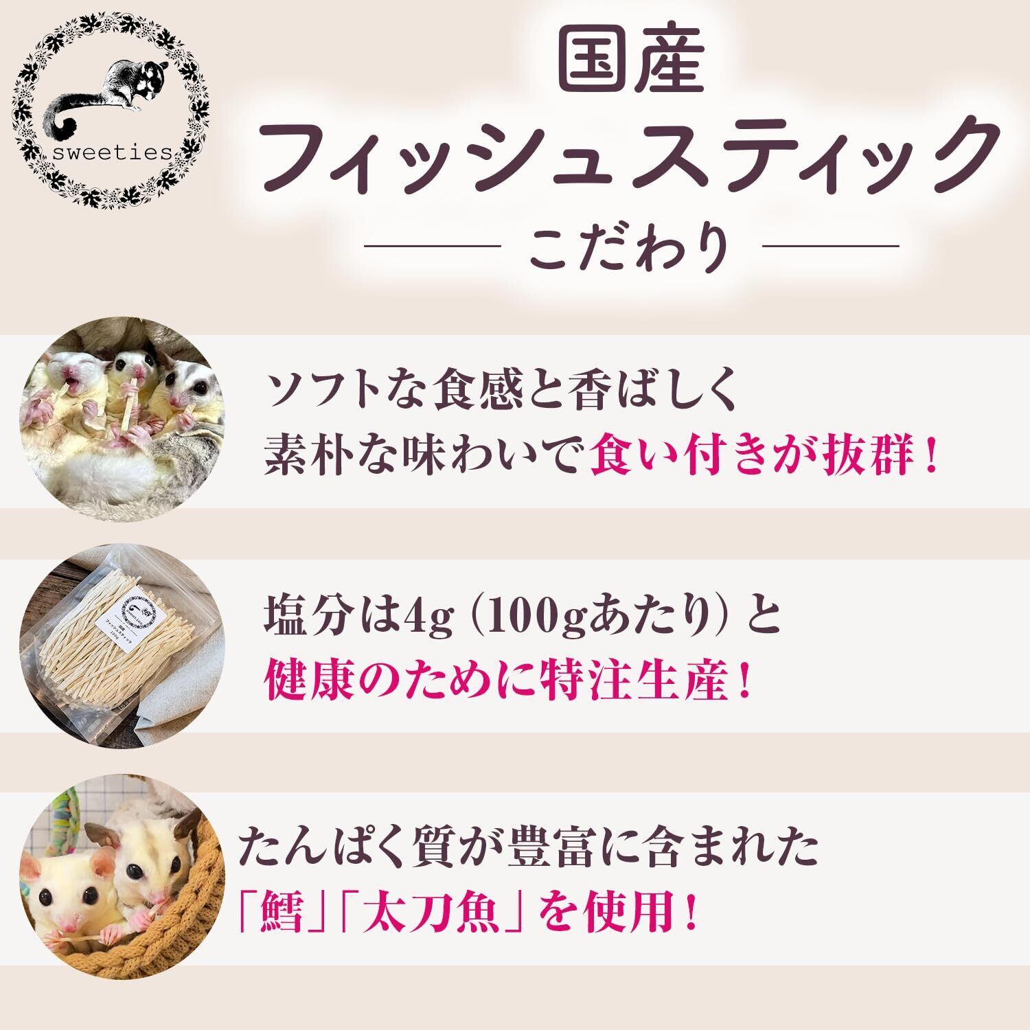 【国産】 小動物おやつ フィッシュスティック 高たんぱく & 食い付き ハムスター フクロモモンガ 100g