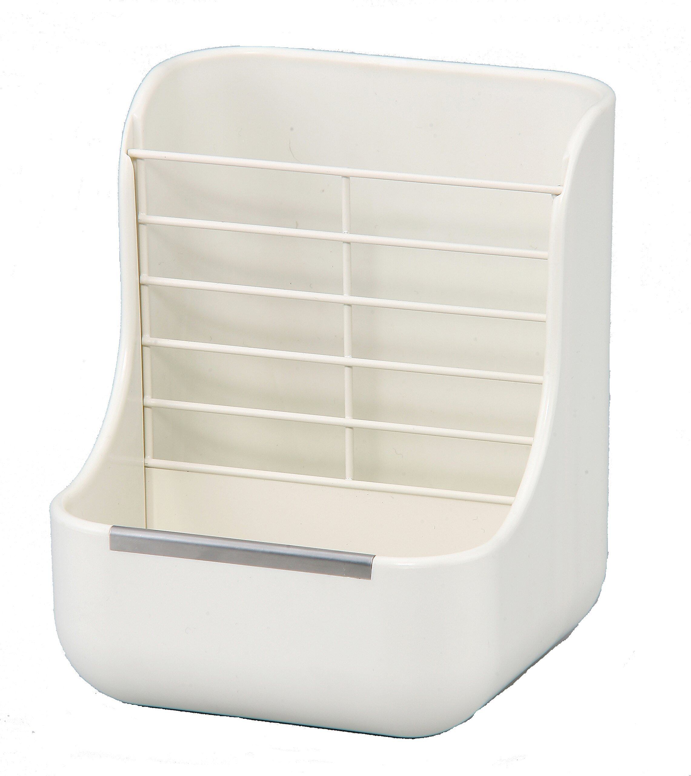 フードと牧草が両方入る牧草がこぼれにくい食器&牧草入れ。 前にフード、後ろに牧草が入れられるので、食べやすい&省スペース。 ケージに簡単固定できる十字溝設計でタテアミ・ヨコアミあらゆるケージにもしっかり固定! 取り外せる仕切りプレートとかじり防止プレート付き。 掃除もエサやりも簡単ラクラクなうさぎ用食器です。