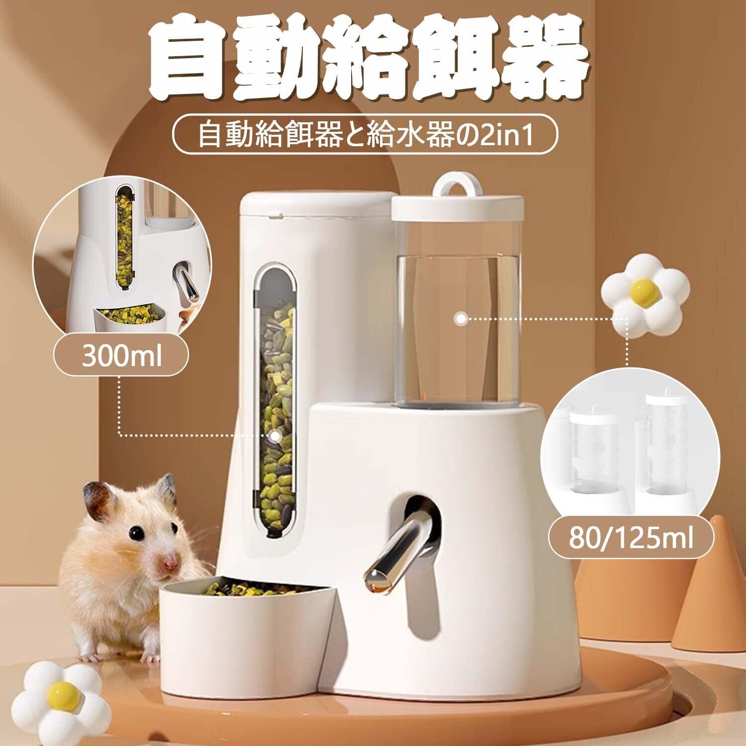 【2in1自動給餌・給水システム】小動物用自動給餌器と給水器が一体になった便利設計。給水器80ml/125ml、給餌器300mlの大容量で、お留守番中のペットの飢餓や脱水を防止します。