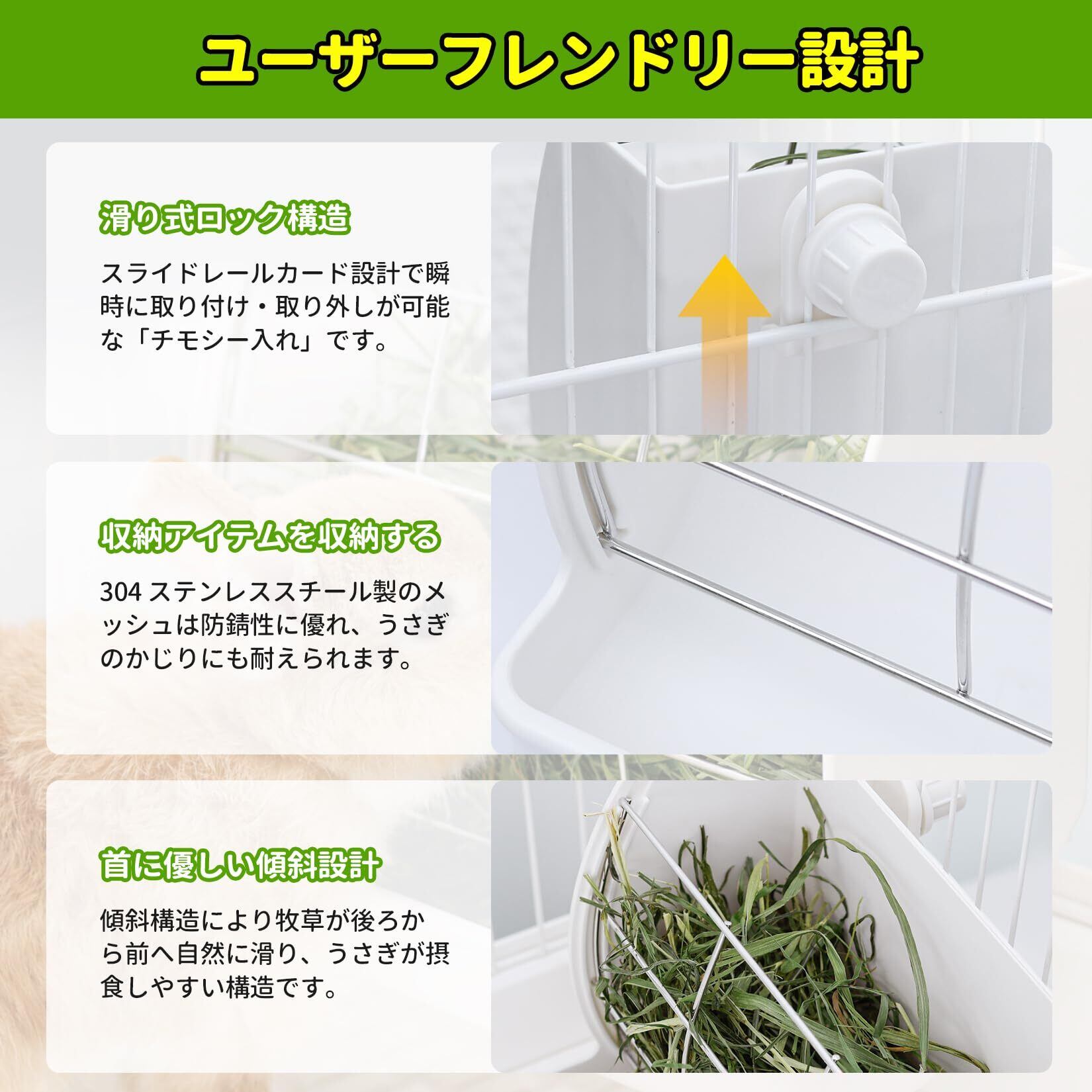ユーザーフレンドリー設計:スライドレールカード設計で瞬時に取り付け・取り外しが可能な「チモシー入れ」です。304 ステンレススチール製のメッシュは防錆性に優れ、うさぎのかじりにも耐えられます。傾斜構造により牧草が後ろから前へ自然に滑り、うさぎが摂食しやすい構造です。