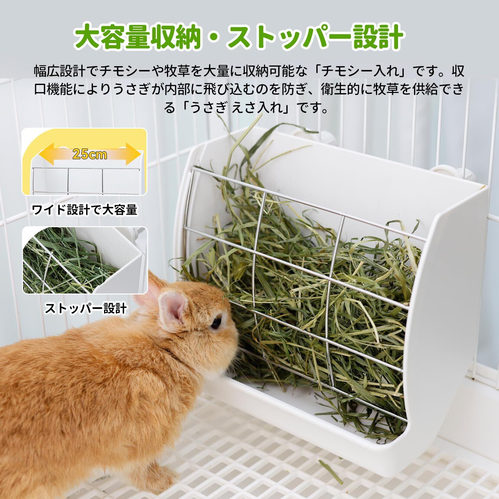 大容量収納・ストッパー設計:幅広設計でチモシーや牧草を大量に収納可能な「チモシー入れ」です。収口機能によりうさぎが内部に飛び込むのを防ぎ、衛生的に牧草を供給できる「うさぎ えさ入れ」です。