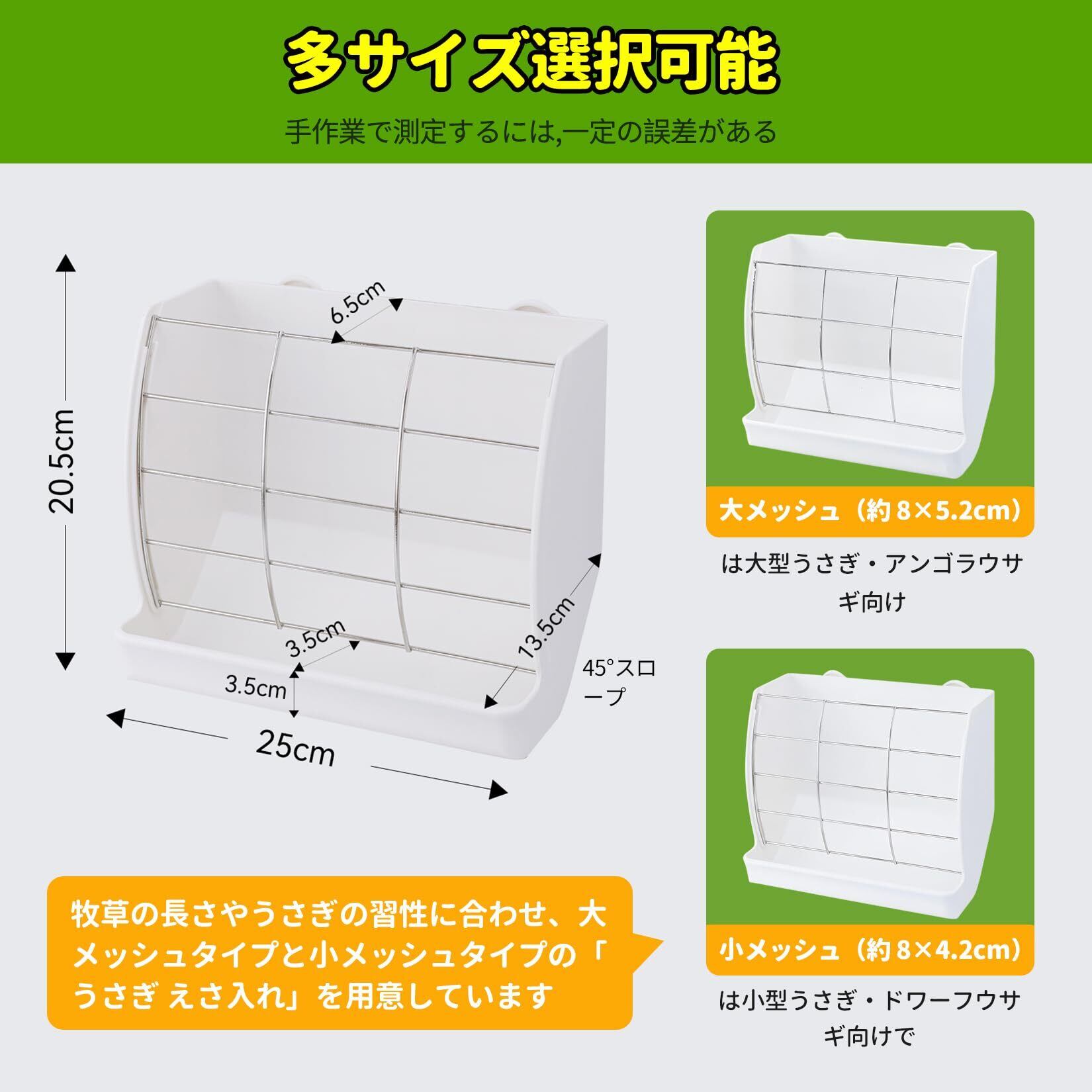 多サイズ選択可能:牧草の長さやうさぎの習性に合わせ、大メッシュタイプと小メッシュタイプの「うさぎ えさ入れ」を用意しています。大メッシュ(約 8×5.2cm)は大型うさぎ・アンゴラウサギ向け、小メッシュ(約 8×4.2cm)は小型うさぎ・ドワーフウサギ向けで、様々な使用シーンに対応できます。