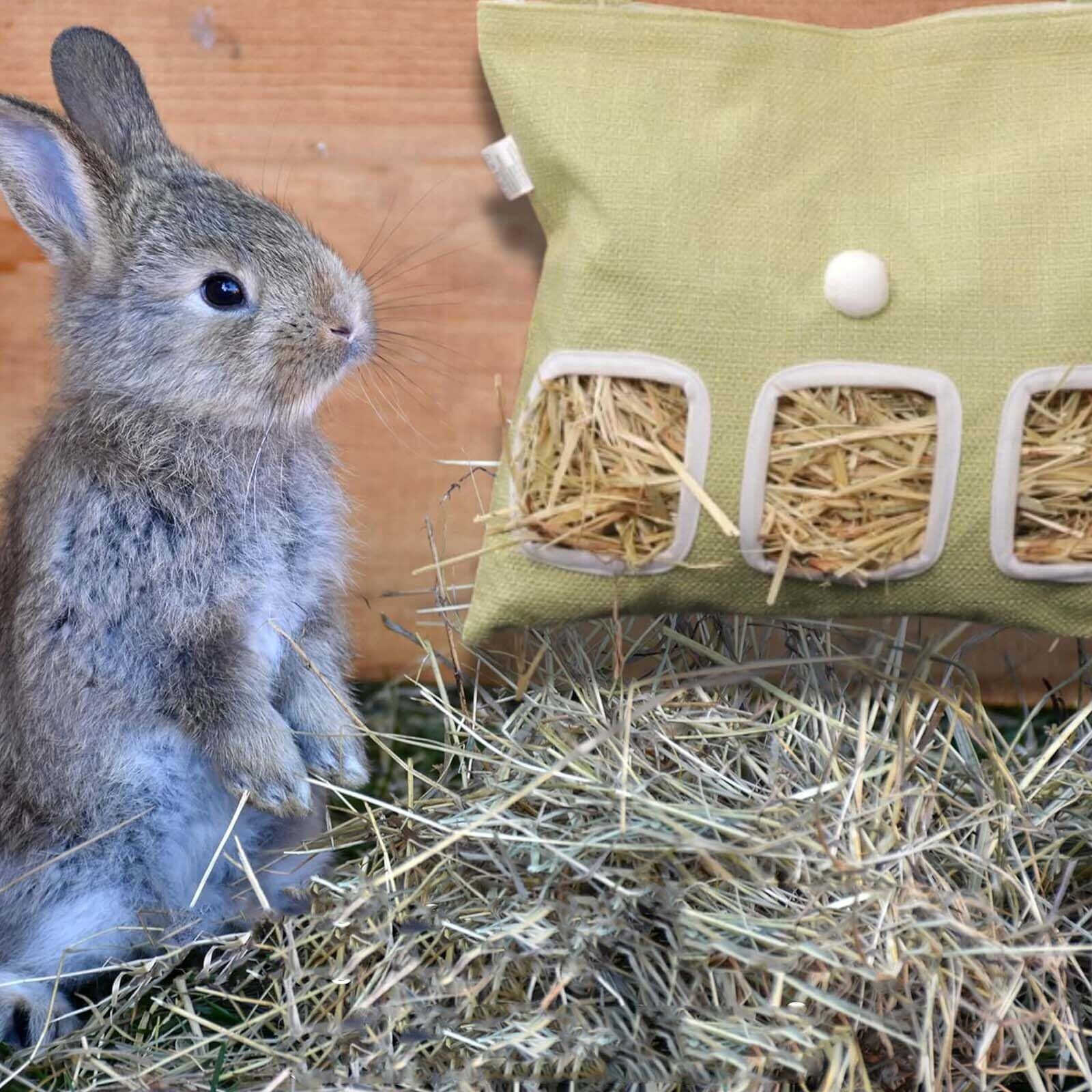 【特価セール】チモシー入れ うさぎ 牧草入れ 餌入れ ケージ用牧草フィーダー えさ入れ吊り下げ式バッグ大容量 散らからない デグー チンチラ モルモット チモシー 干し草袋 可愛い耳付き 小動物用食器ペット用品 (グリーン, 2つの穴-S:25*28cm)