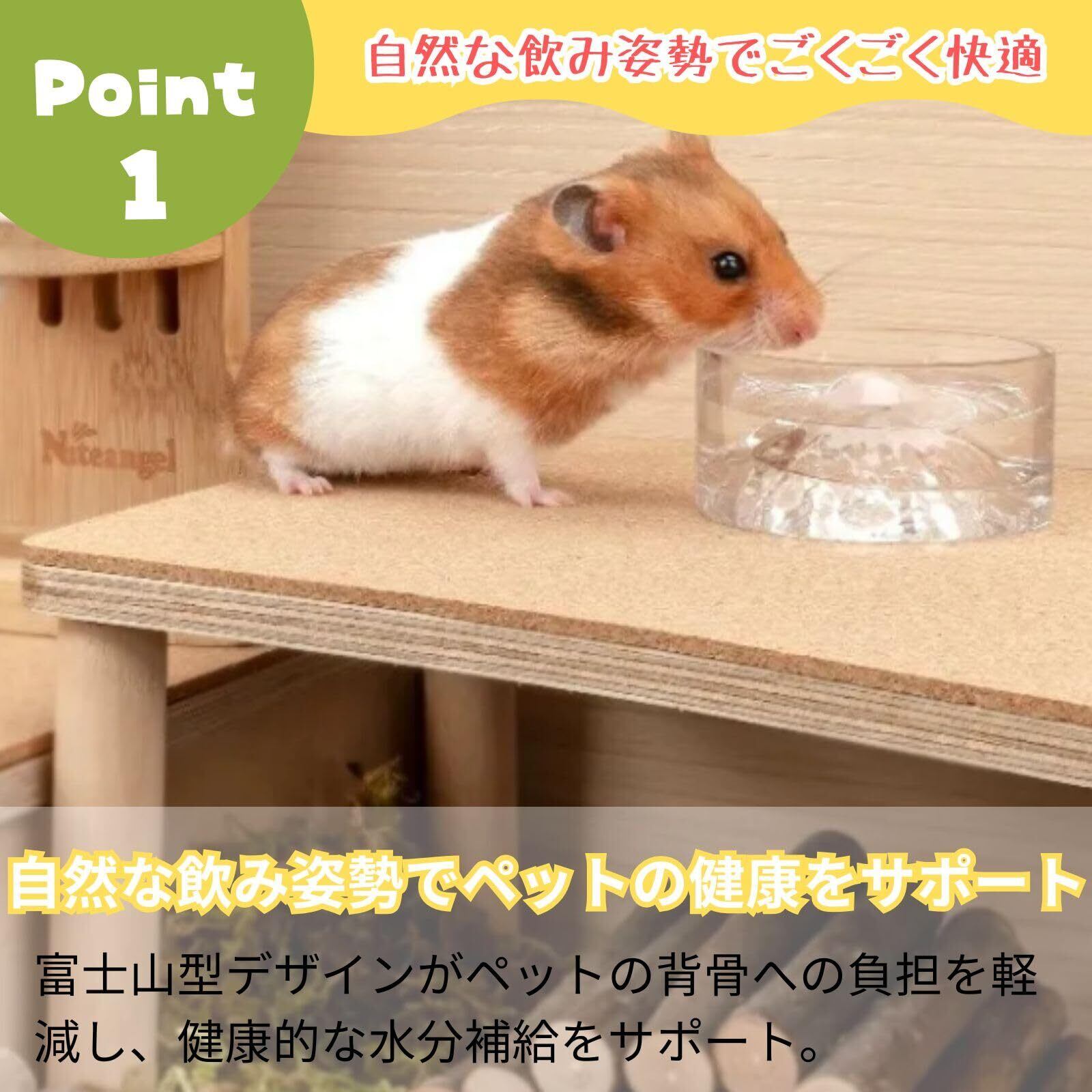 【自然な飲み姿勢でペットの健康をサポート】富士山型デザインが背骨への負担を軽減し、ハムスターやシリアンハムスター、ジャービルなどの小型ペットが快適に水を飲めます。