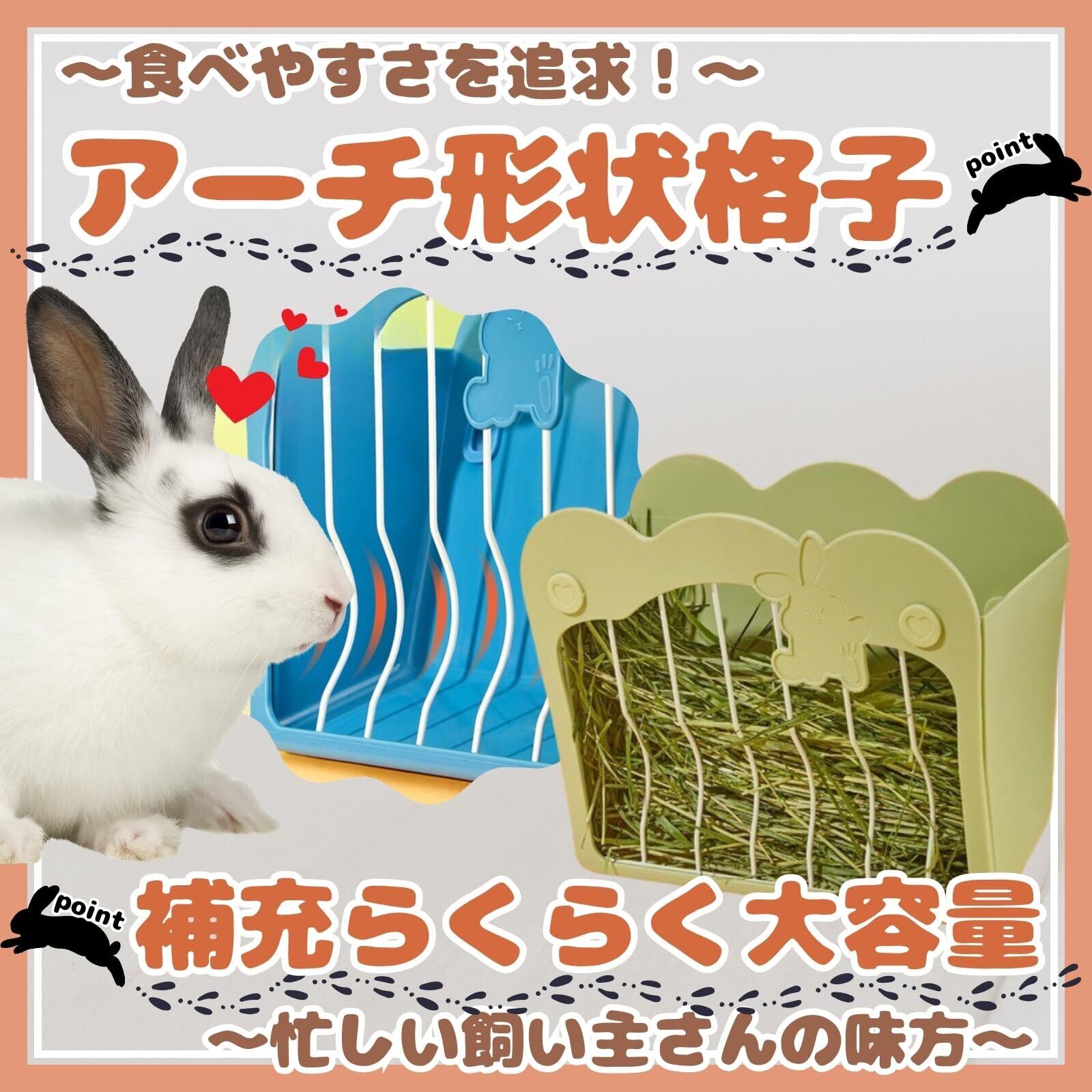 【牧草が散らかりにくいワイドフィーダー】ウサギやモルモットなど小動物のための、大容量チモシーポットです。広口設計でたっぷり牧草を入れられ、網状の食べ口が牧草の飛び散りを防止。ケージ内や周囲を清潔に保てる衛生的なデザインです。