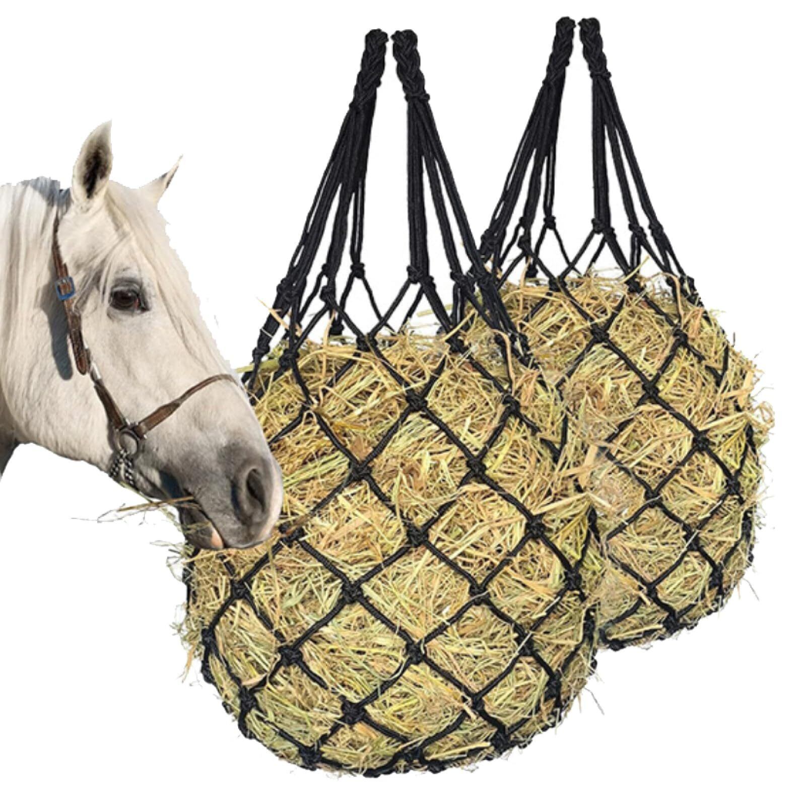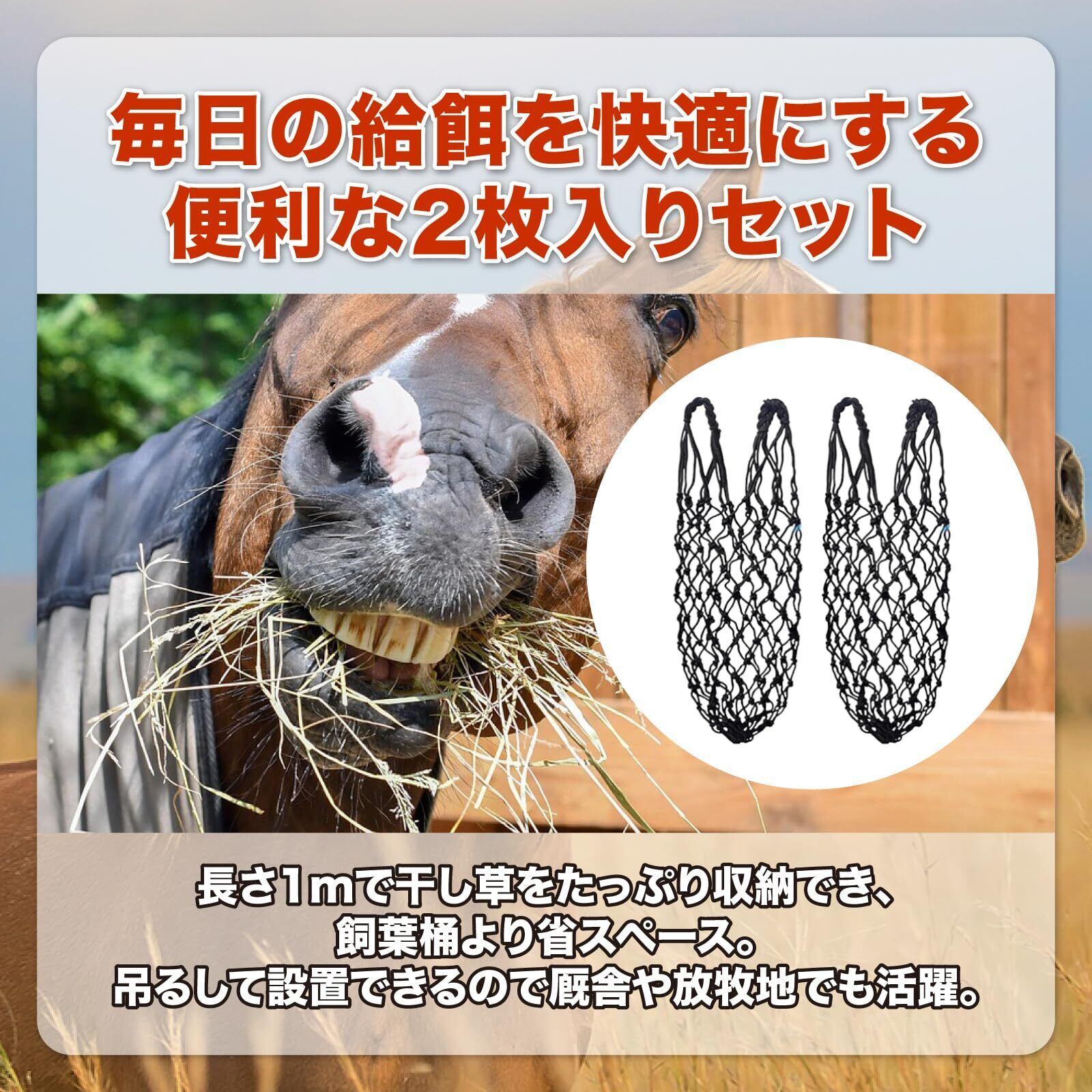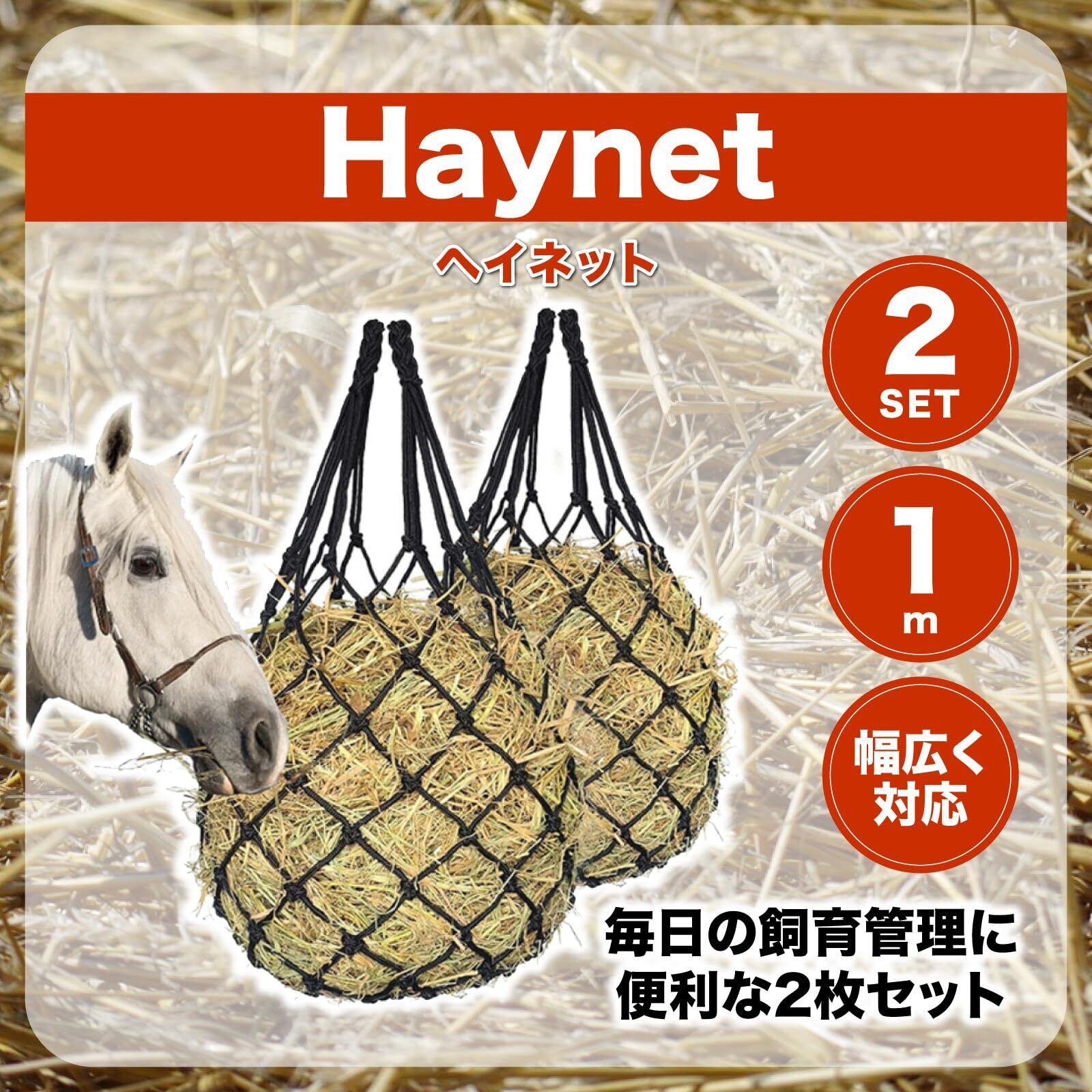 【ヘイネット 便利な1mサイズで幅広く対応】ヘイネットは、馬やロバ、ポニーはもちろん、ヤギやヒツジ、アルパカなど草食動物に最適。長さ1mで干し草をたっぷり収納でき、飼葉桶より省スペース。吊るして設置できるので厩舎や放牧地でも手軽に活躍。毎日の飼育管理に便利な2枚セットです。