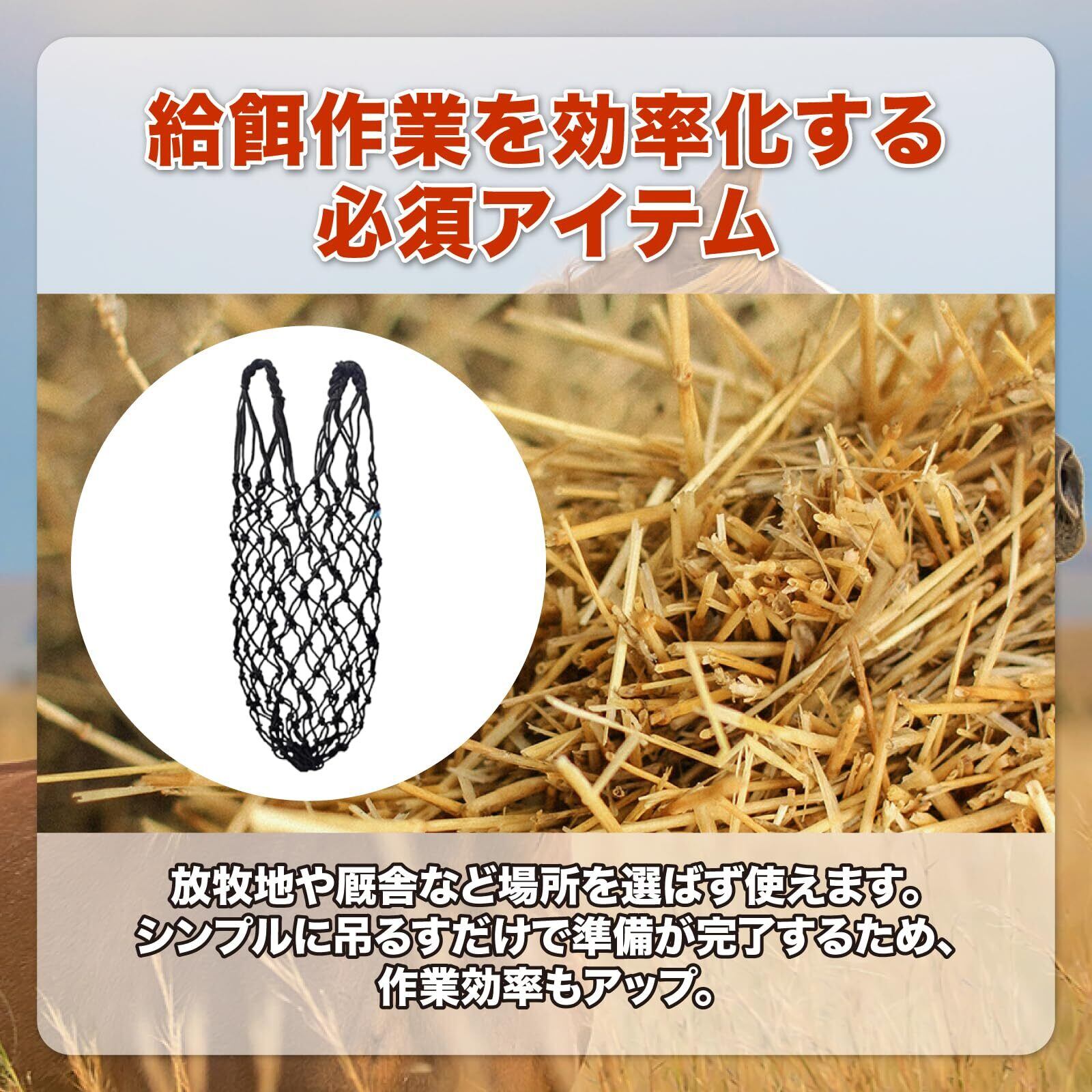 【放牧地・厩舎・イベントに最適】ヘイネットは放牧地や厩舎など場所を選ばず使えます。シンプルに吊るすだけで準備が完了するため、作業効率もアップ。複数頭の飼育環境や移動先でも便利で、洗い替えや予備としても重宝します。2枚セットなので、日常使いからイベント利用まで幅広く対応できます。