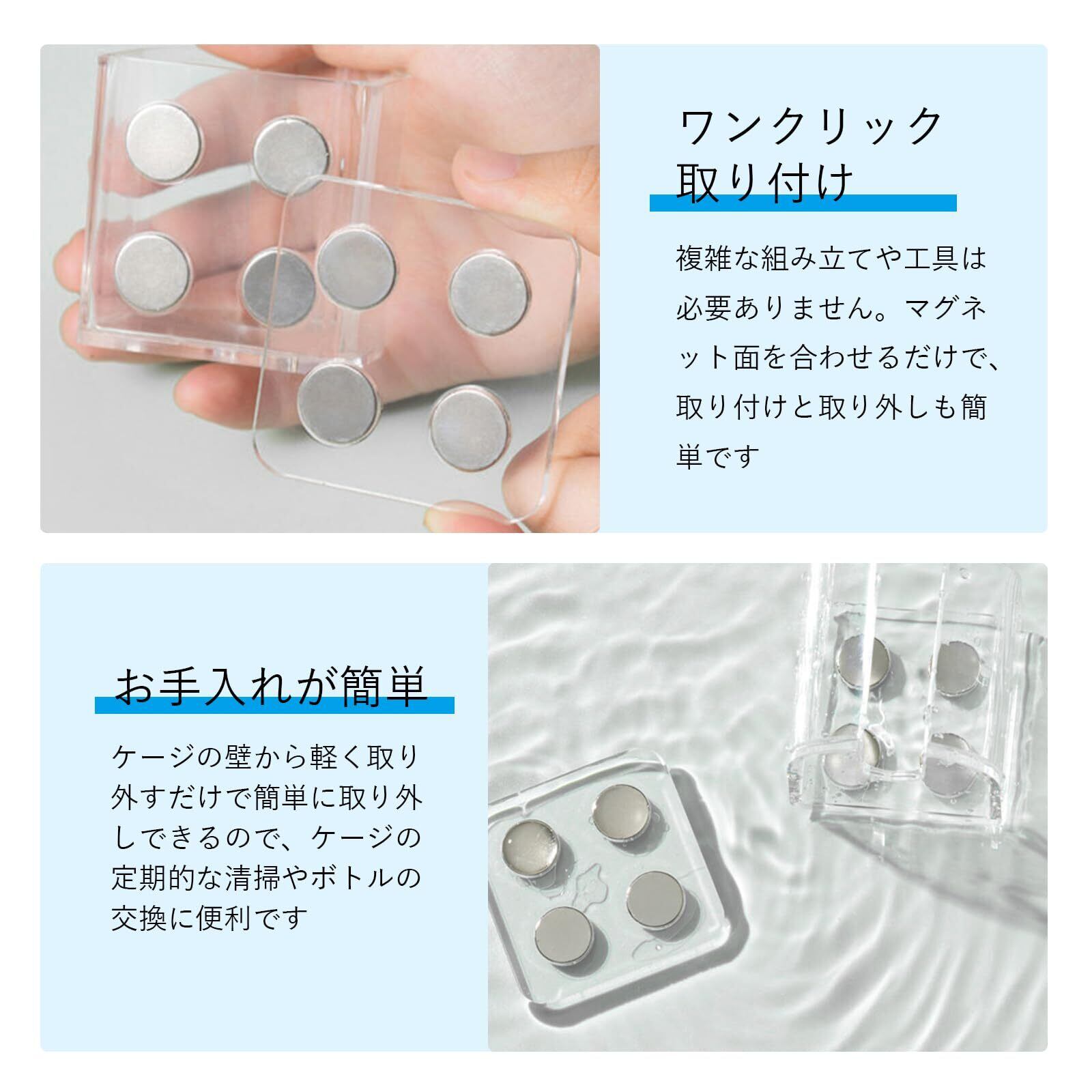 【強力な磁石デザイン】磁気吸着で、金属網のケージやアクリルケージにしっかりと固定され、工具は必要ありません。給水ボトルの位置を移動や調整することも簡単で、跡を残しません。