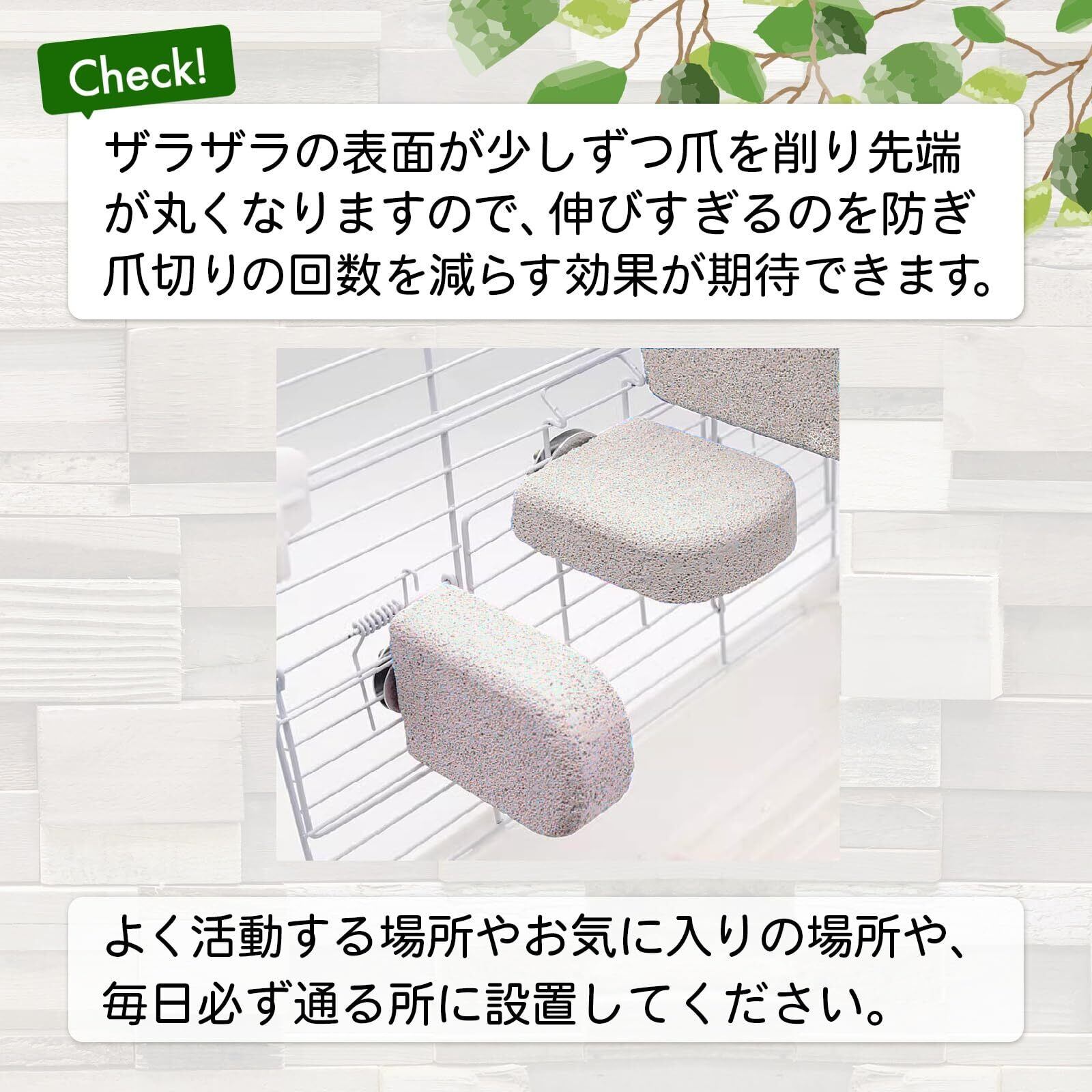 本品は、デグー・ハムスター・モモンガ・小鳥など、さまざまな小動物に対応したケージ取付型の爪とぎステップです。 ざらざらとした軽石素材が、上に乗ったり通ったりするだけで少しずつ爪や歯を削ってくれます。 爪切りの回数を減らし、ペットにも飼い主にも優しい仕様です。 蝶ねじ&ワッシャー付きで工具不要・しっかり固定。 ケージの内側から取り付けるだけで、横向きにも縦向きにも設置可能です。 コンパクトなショートサイズで、複数設置して階段ステップとしての運動性もアップ。 毎日よく通る場所やお気に入りの場所に設置して、自然にケアを習慣化しましょう。