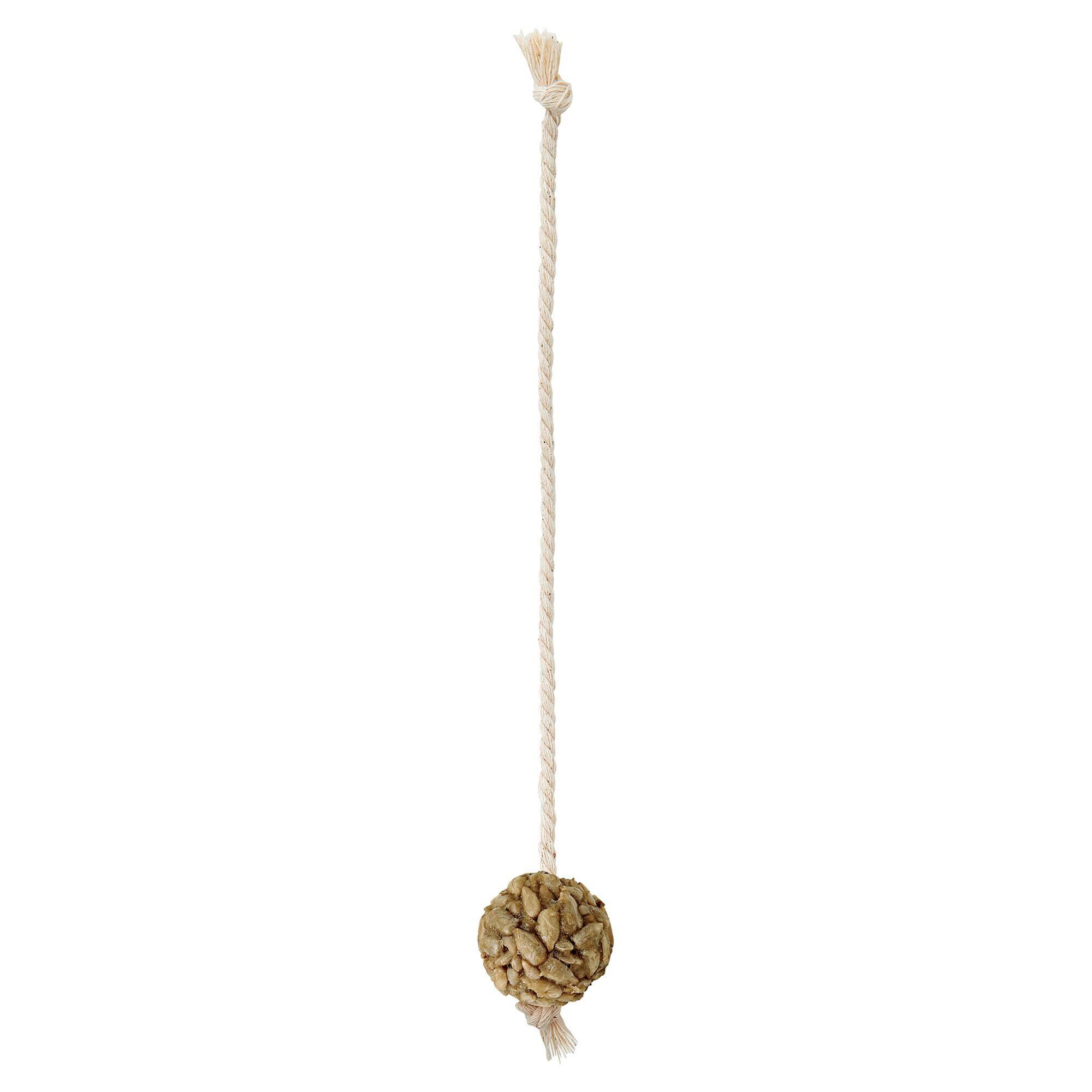 ムキひまわりの種をボール状に固めた、食べられるおもちゃです。ケージに吊るせるロープ付きです。