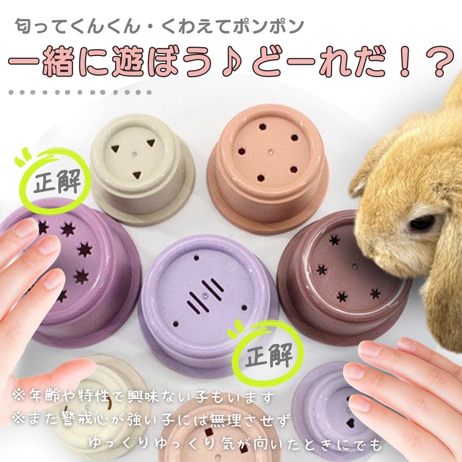 【楽しく遊んでおやつをGET!】カップの中におやつを入れて、兎さんが咥えてカップを外すことで大好きなおやつを見つけることができます。遊ぶ楽しさ、見つける喜び、ぽんぽんモグモグと、とても可愛いです