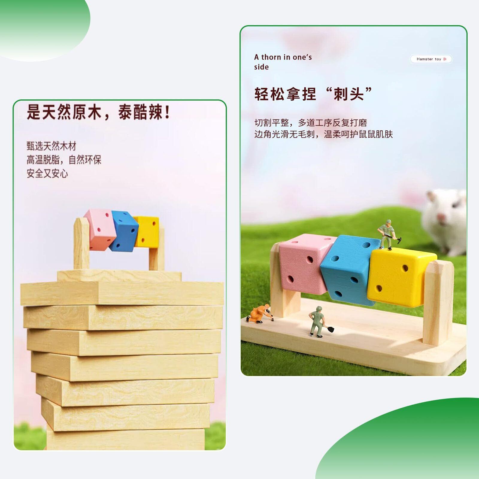 SensaBliss ハムスターおもちゃ 木製かじり木 ハムスターサークル 小動物用品 ハムスター爪研ぎ デグーおもちゃ モルモットおもちゃ カラフルサイコロ ハムスタートンネル ハムスター遊具 ケージの中で単調な日々を過ごすハムスターや小動物たちに、安全で楽しい遊び時間を届けるのが SensaBliss ハムスターおもちゃです。この商品は木製プラットフォームをベースに、ハムスターの日常ニーズに合わせて多機能を凝縮し、小動物用品の中でも人気の選択肢となっています。