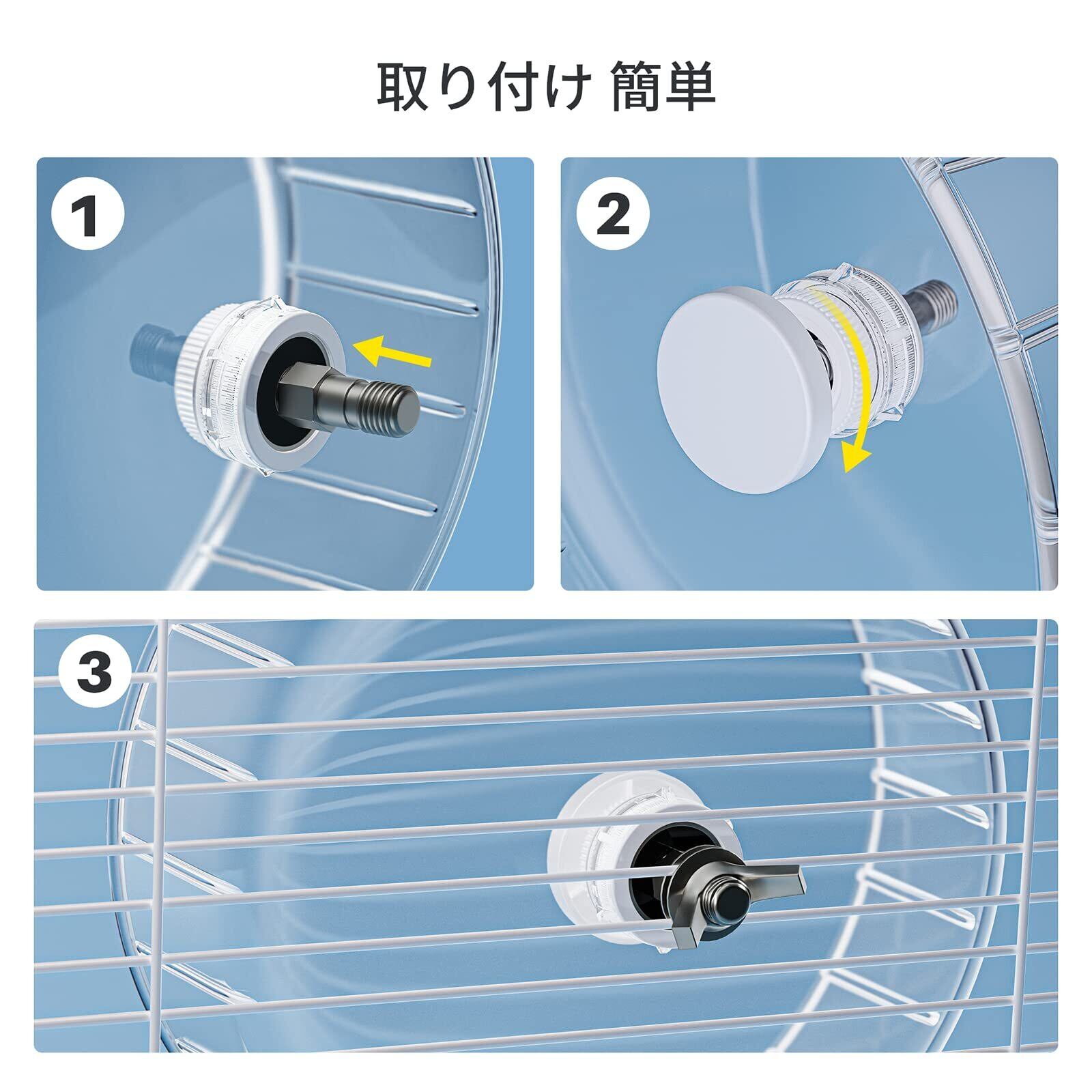 【簡単着脱できる】回し車は取り付けが簡単で、ワイヤーケージに設置するのにぴったりです。スタンドがないので、必ずケージワイヤーに取り付けて使用します。分離も簡単で、お手入れも楽に行えます。(ご注意:回転パーツは絶対に水で洗わないで下さい。)申し訳ありませんが、この製品には説明書がないかもしれません。使用するときは、製品ページの説明書を参照してください。