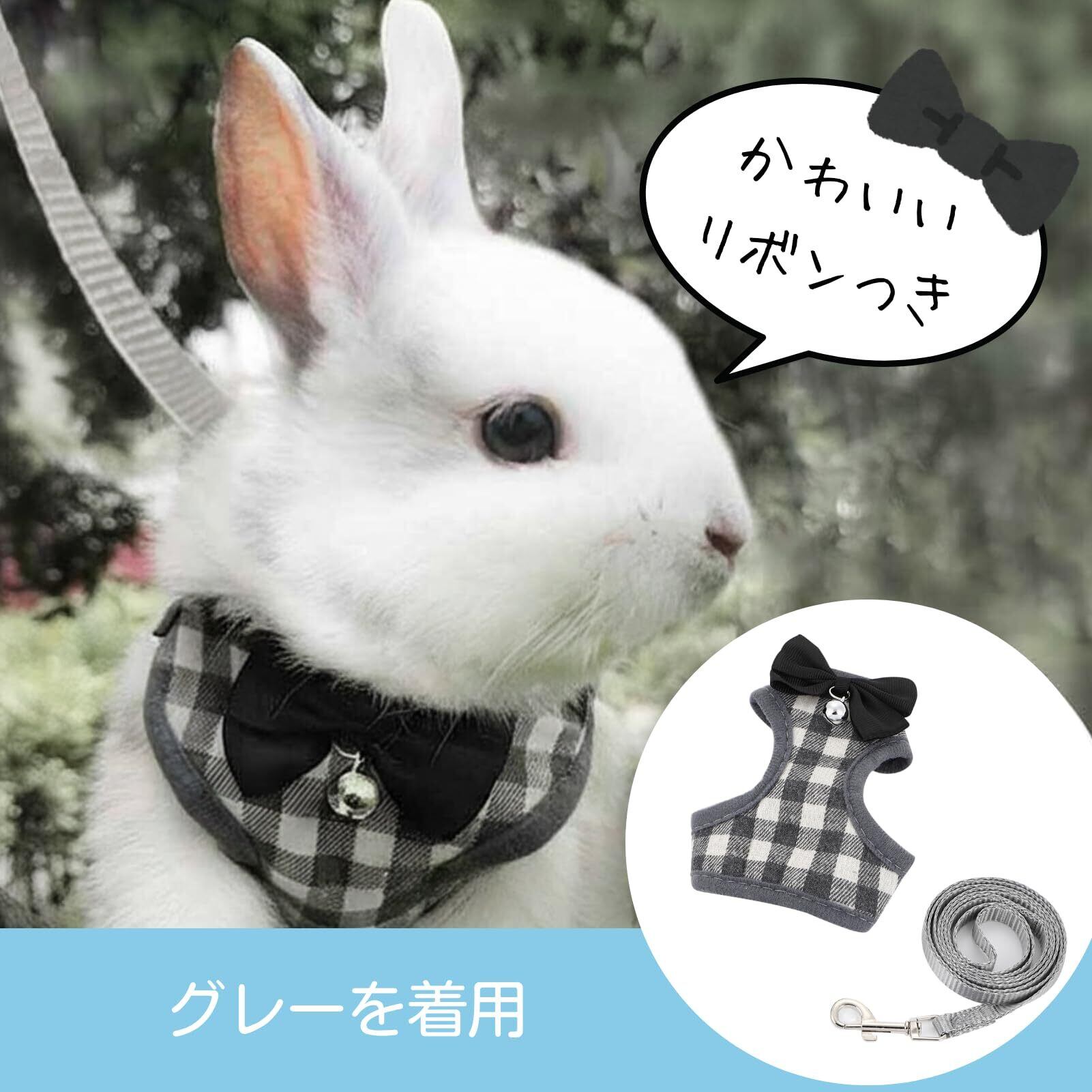 Uccellino リボン うさぎ ハーネス 通気性 長さ調整可 リード 簡単装着 ウサギ用ハーネス (グレー(チェック))