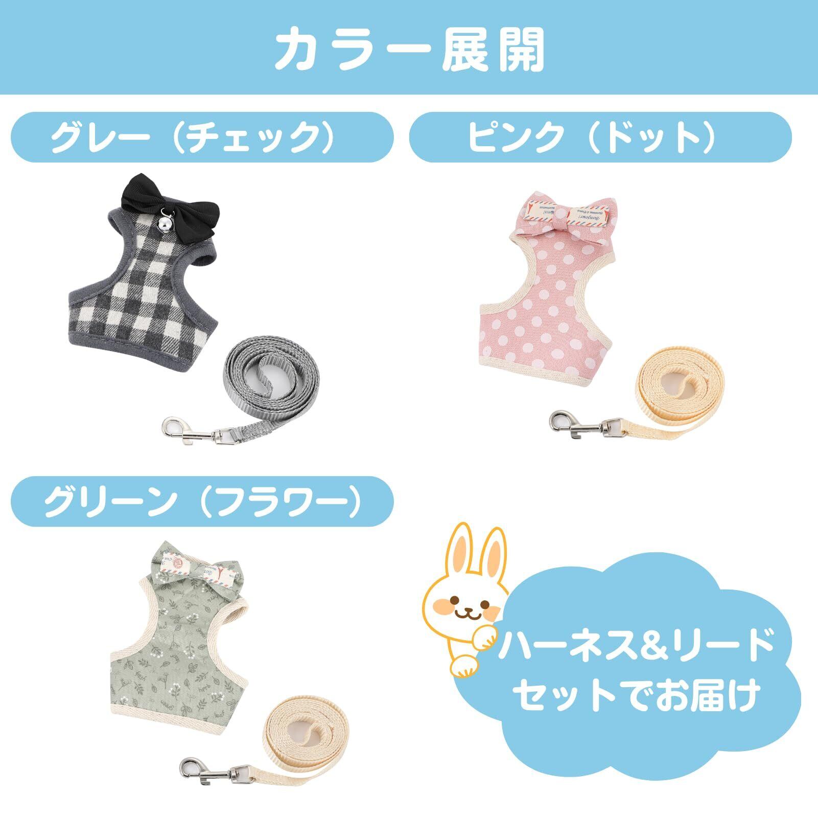 Uccellino リボン うさぎ ハーネス 通気性 長さ調整可 リード 簡単装着 ウサギ用ハーネス 【かわいい!リボン付きハーネス】リボンがキュートなうさぎ用ハーネスです。おしゃれな柄は、普段のお散歩だけでなく、ちょっとしたお出かけやフォーマルな場面にもぴったり。 【メッシュ素材】裏側はメッシュ素材なので通気性が良く熱がこもりません。春・夏・秋のお散歩に最適です。 【調整可能】アジャスターでサイズ調整が可能です。うさぎちゃんに合わせて大きさを調整できます。 【選べる3色】ピンク(ドット)・グレー(チェック)・グリーン(フラワー)の3色からお選びください。かわいいハーネスにリードもセットでお届けします。 【サイズ】サイズの目安 首回り15-20cm 胸周り:20-30cm ウサギ用のハーネスですが、サイズによっては合わないことがありますのでサイズ目安をご確認ください。