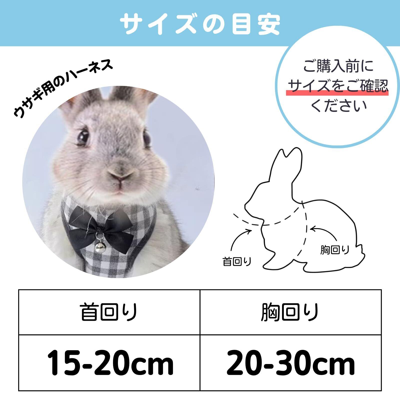 【サイズ】サイズの目安 首回り15-20cm 胸周り:20-30cm ウサギ用のハーネスですが、サイズによっては合わないことがありますのでサイズ目安をご確認ください。