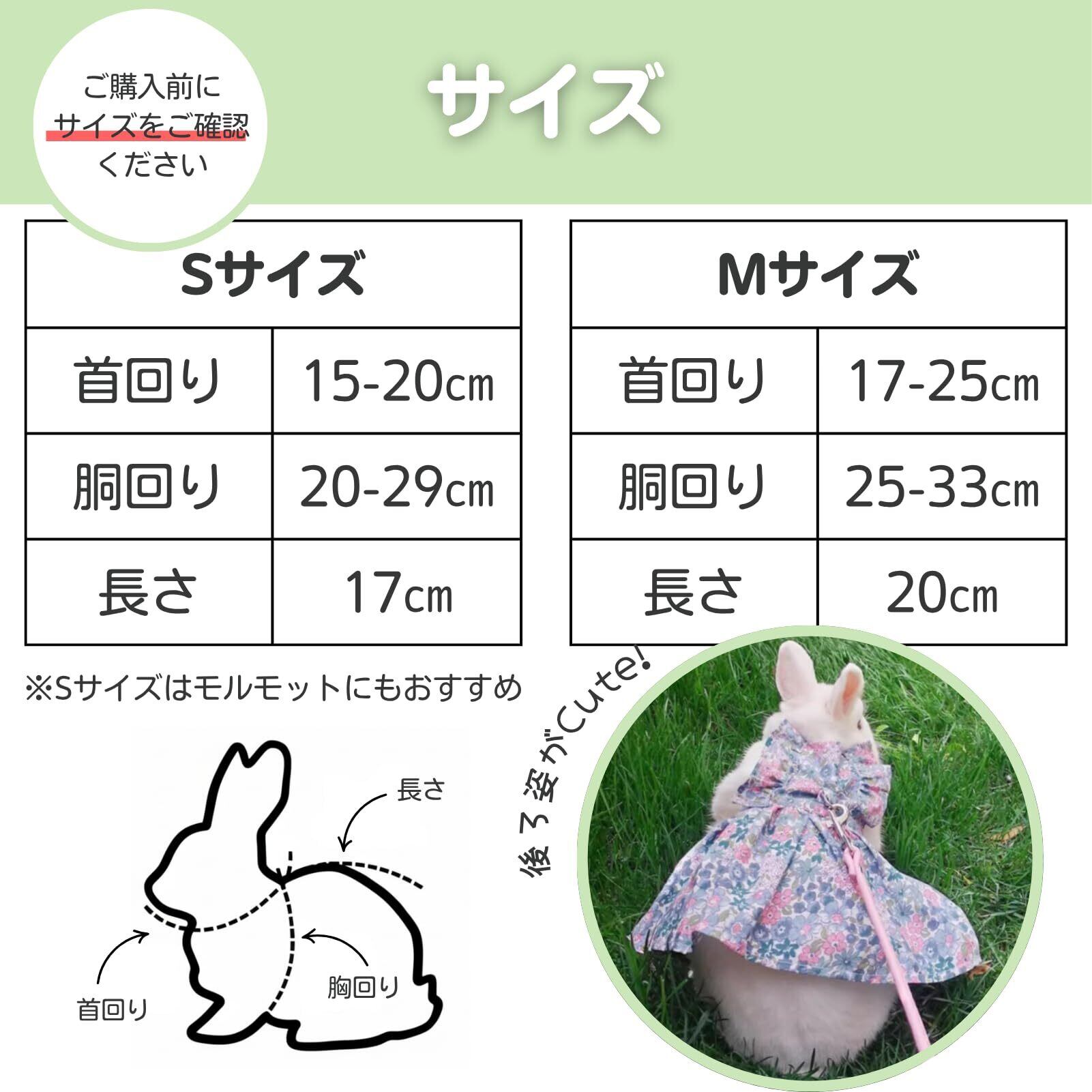 Uccellino 花柄 うさぎ ハーネス 綿 長さ調整可 コットン リード 簡単装着 ウサギ用ハーネス 防災用品 【かわいい!うさぎのハーネス】花柄がキュートなウサギ用ハーネスです。おしゃれな柄は、普段のお散歩だけでなく、ちょっとしたお出かけやフォーマルな場面にもぴったり。まるでお洋服を着ているようなかわいいハーネスです。 【うさんぽに最適】ペットのお散歩は気を使うものですが、このハーネスがあればうさんぽも楽々です。また、災害時の抜け出し・迷子防止のためにも災害袋に一つ入れておくと安心です。 【優しいコットン素材】肌触りの良い綿素材です。蒸れにくく刺激が少ないので大事なペットにおすすめです。 【選べる3色】ピンク・イエロー・ブルーの3色からお選びください。かわいいハーネスにリードもセットでお届けします。 【サイズ】サイズの目安 <Sサイズ> 首回り:15-20cm 胸周り:20-29cm 長さ:17cm ※モルモットにもおすすめ <Mサイズ> 首回り:17-25cm 胸周り:25-33cm 長さ:20㎝ ウサギ用のハーネスですが、サイズによっては合わないことがありますのでサイズ目安をご確認ください。