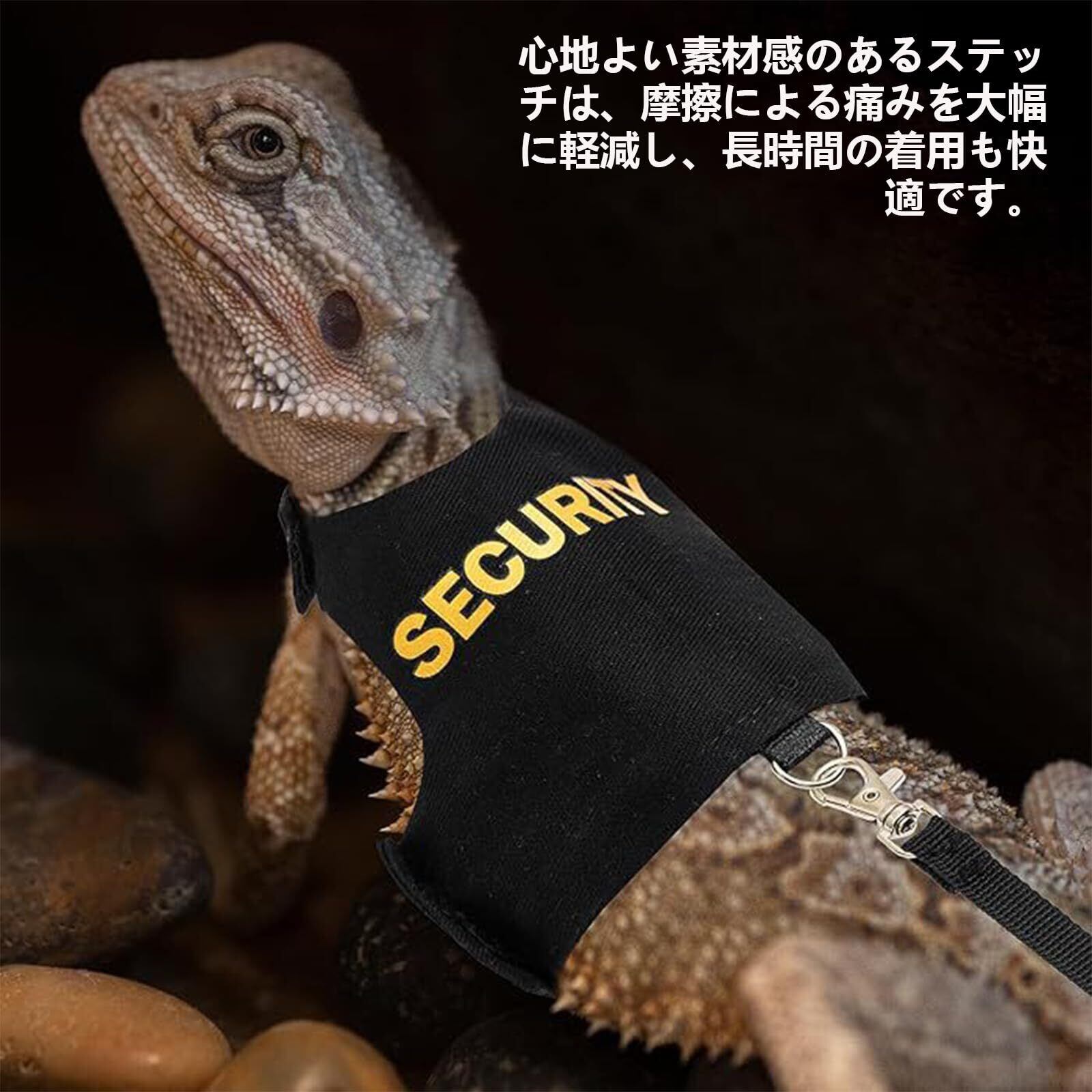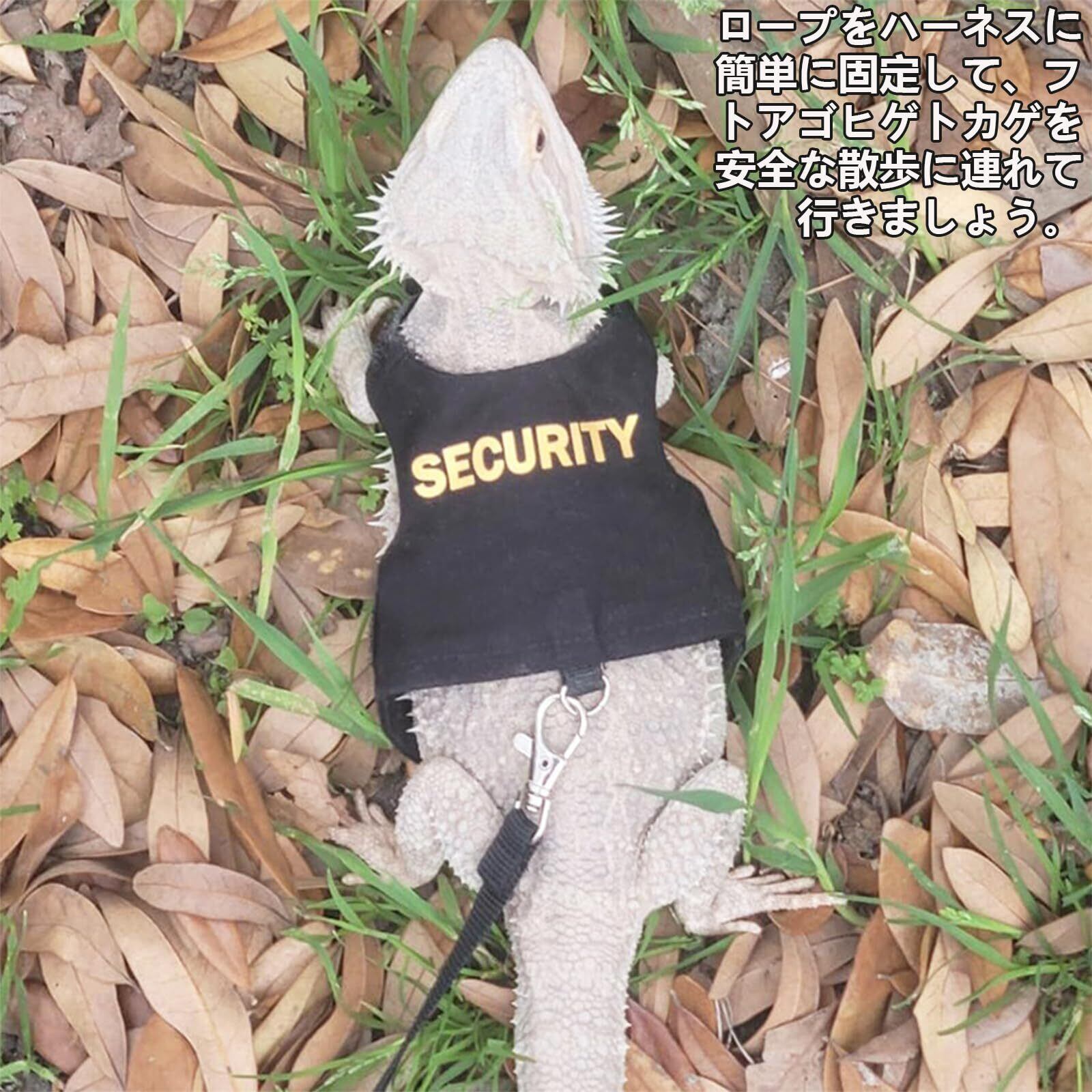 【安全性の確保】背面に「SECURITY」の文字が入った当社のハーネスで安心感を抱き、騎士のようなデザインがフトアゴヒゲトカゲの冒険に奇抜なタッチを加えながら安全を確保します。