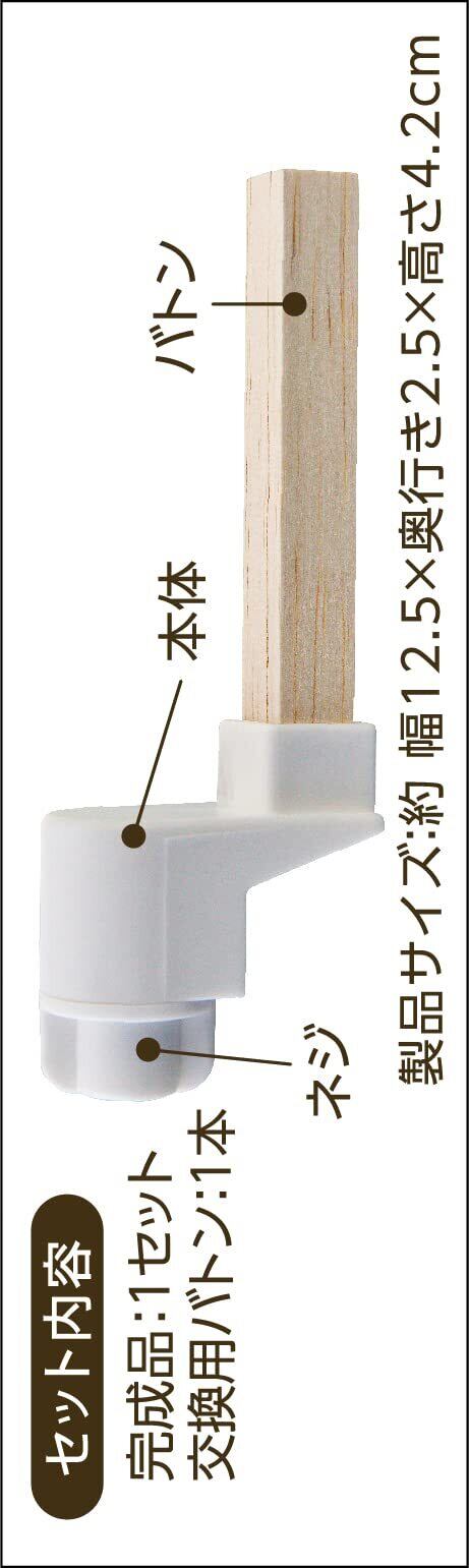 簡単に付け替えられ、かじりやすい固さの広葉樹のかじり木。 ●付け替えカンタンかじり木 ●かじりやすい固さの広葉樹 ●金属・接着剤不使用 ●差し込むだけでカンタンに交換! ●低アレルギー素材の広葉樹を使用 ●ワイヤーケージでも使用OKの取り付け器具採用 組立時サイズ:約 幅12.5×奥行き2.5×高さ4.2cm セット内容:完成品1セット、交換用バトン1本 <使い方>本製品を飼育ケージの中に入れ、付属の部品で固定し取り付けてください。●ワイヤーケージに設置●ハムスターが届く位置を確認し、取付け位置を決めてください。バトンを本体にセットします。本体のネジを外し、飼育ケージの内側からはさんで固定してください。※ワイヤーの間隔が25mm以上のものには使用できません。※本製品を設置する場所は、水平が保たれる安定した平面を選んでください。 ●グラスハーモニー(別売)に設置●バトンを本体にセットします。ボトル取付け穴の専用キャップを取り外してください。本体のネジを外し、ケージの内側からはさんで固定してください。 ※バトンが短くなったり汚れが目立ち始めたら新しいものに交換してください。(ハーモニーバトン5本入(別売)) ※天然素材のため、形状や木目、木の色の違いがありますので、ご了承ください。