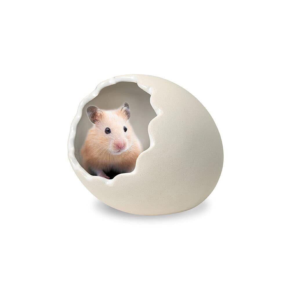 ハムスターが入る事で、まるで卵から生まれたかのような演出が可能な陶器製ハウス。卵の内側は汚れが落としやすいように釉薬コーティング、外側はザラついていて、爪とぎ効果が期待できる仕様。ケナフの巣材が少量付いているのですぐに使う事も可能。ゴーリデンハムスターにぴったりのMサイズ。