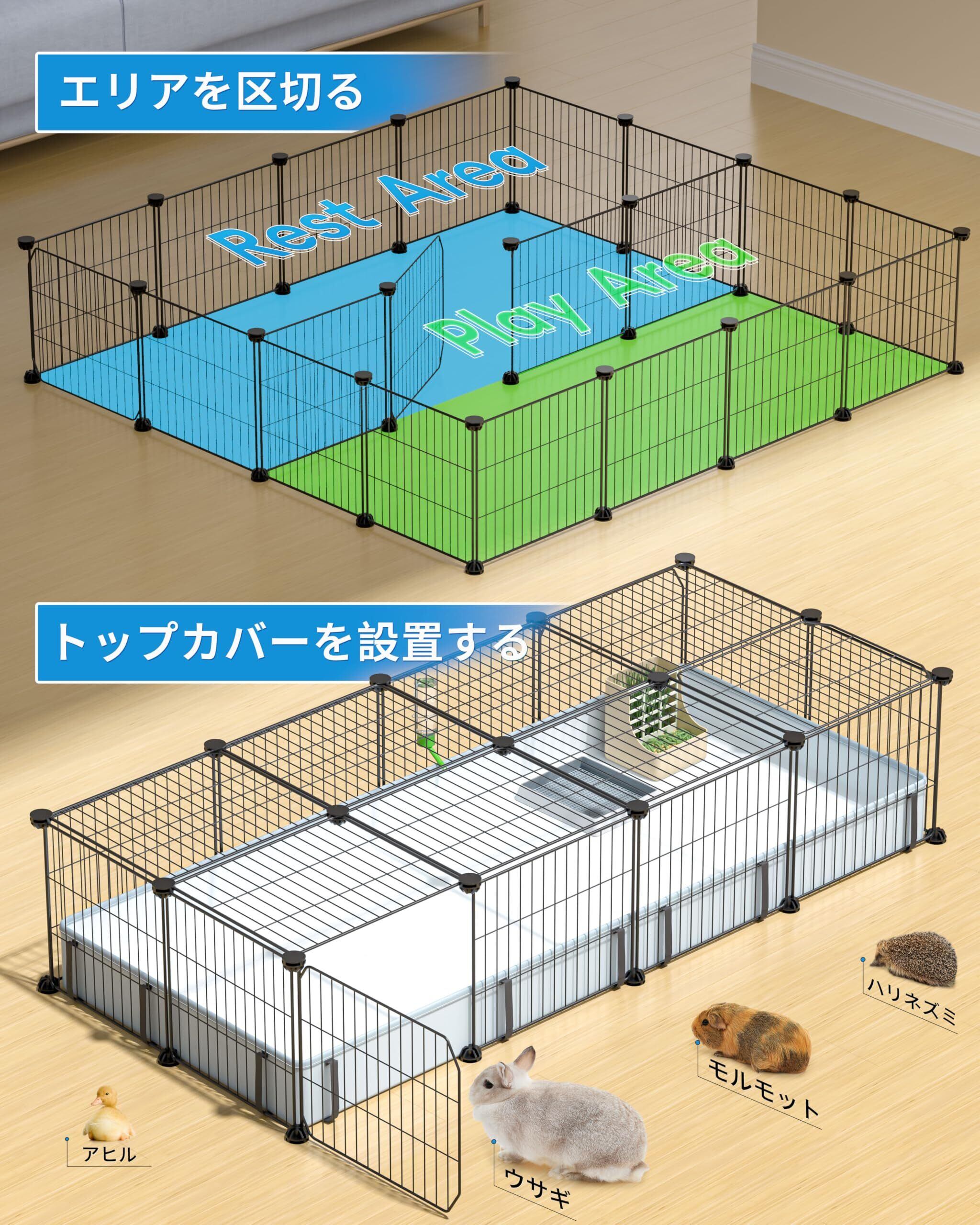 【簡単組み立て・複雑な組み立てをさようなら!】※画像をスワイプすると、取付け動画が表示されます※パネルの一角をABSコネクタに差し込んで、隙間がなくなるまで押し込み、結束バンドで固定するだけで組み立てが完了します。使用環境に応じて、20枚のパネルを活用して長方形や正方形などの形状にケージを変更することができます。