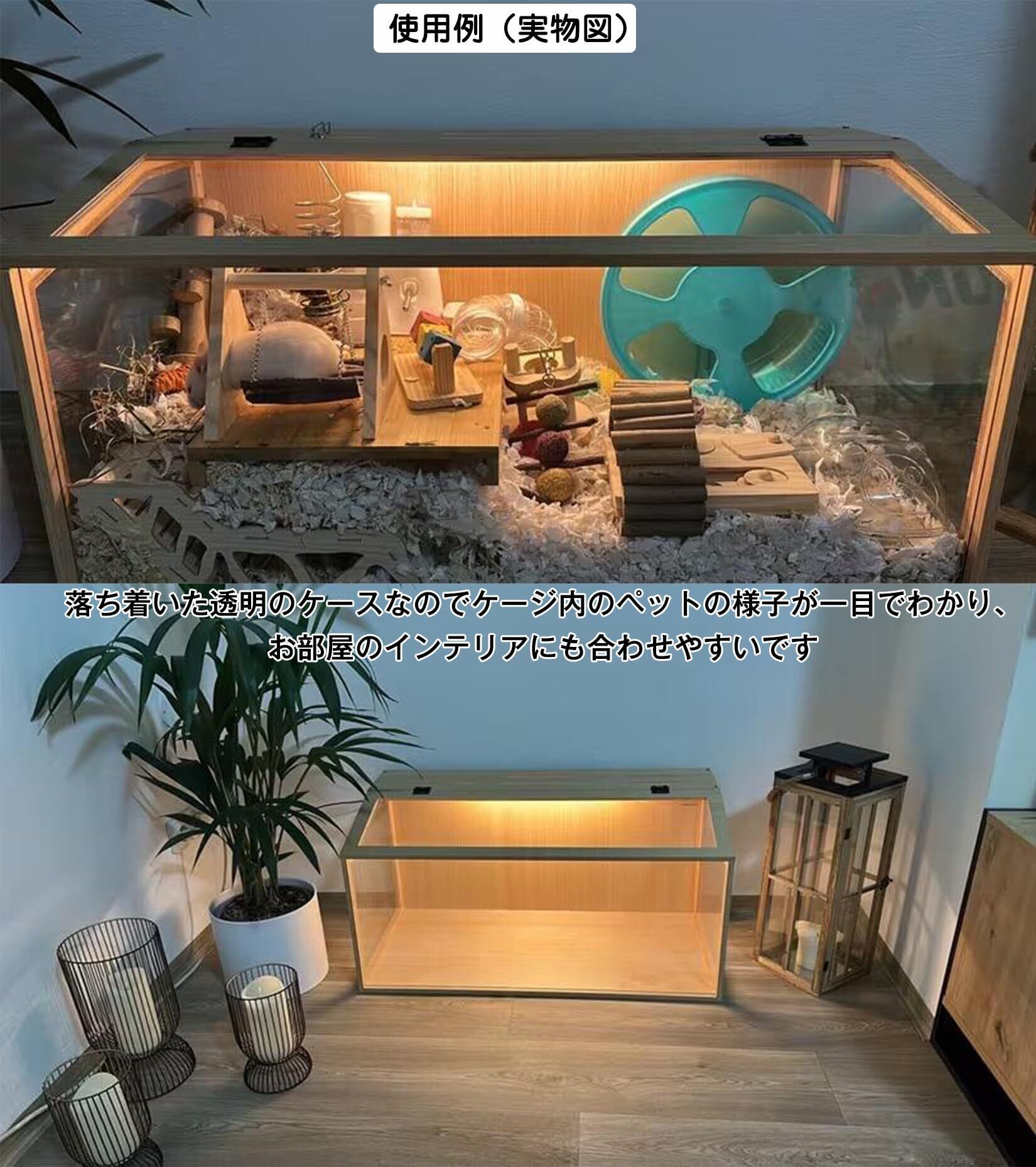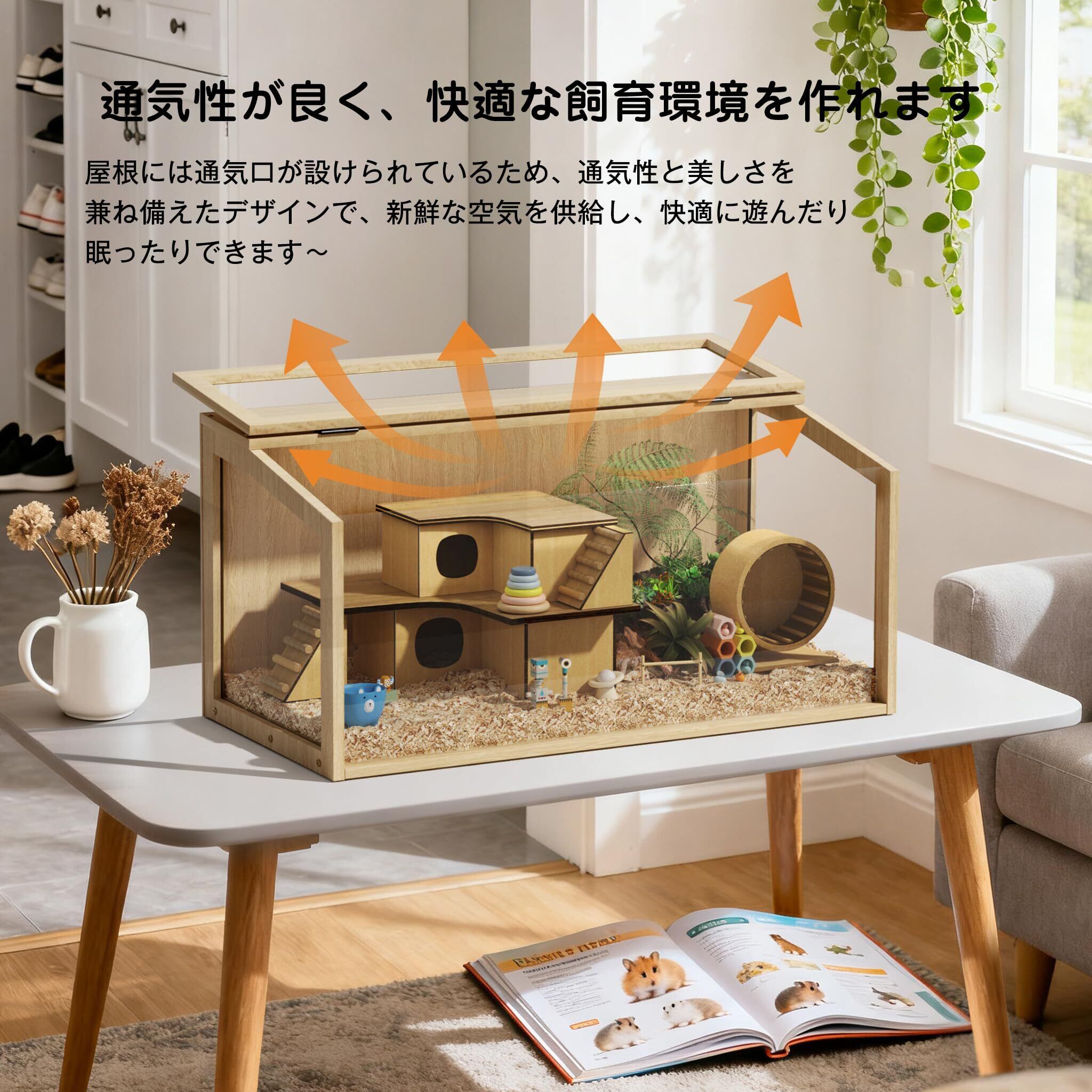 【ガラス製で、観察しやすいクリア仕様】高級感のある透明ガラスボードと木材を組み合わせたハムスターケージで、開放感と光溢れる暮らしの空間を与えます。圧迫感が少なくペットの様子がよく見え、ケージ内のレイアウトにこだわりたい人にも適しています