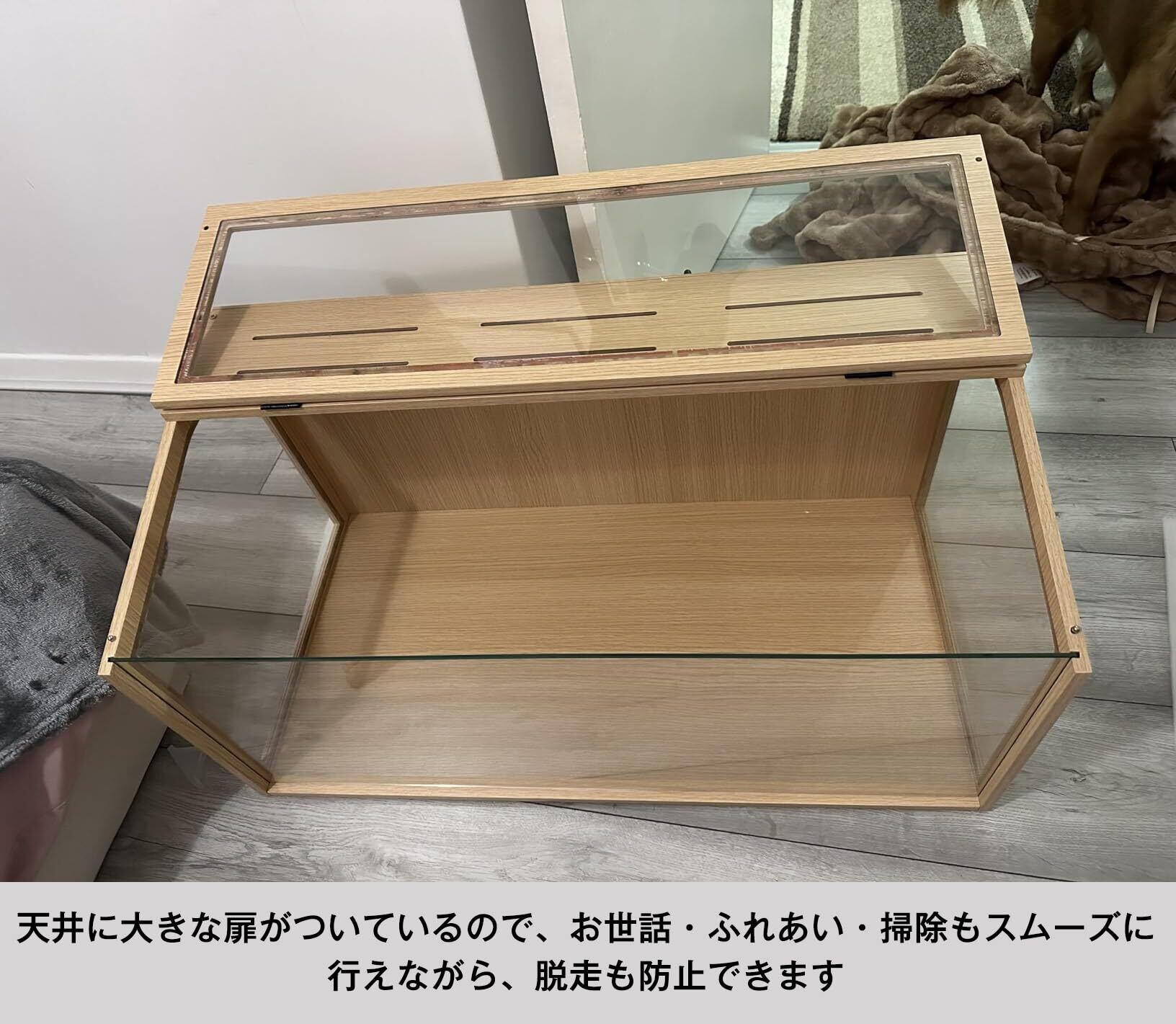 【掃除しやすい設計】天井に大きな扉がついているので、お世話・ふれあい・掃除もスムーズに行えながら、脱走も防止できます。また、手前のガラス板が簡単に取り外せるので、木屑やゴミを出しやすくお掃除もラクラクです