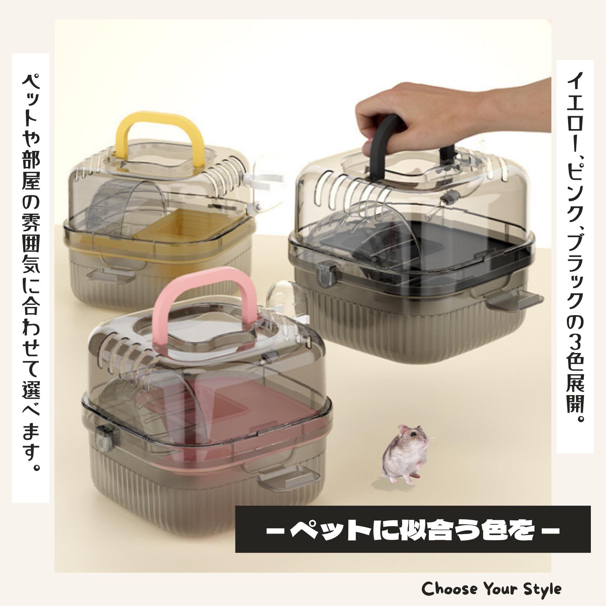 【商品詳細】 ・素材:プラスチック / 金属 ・カラー:イエロー / ピンク / ブラック ・サイズ:約21×21×18cm ・特徴:ランニングホイール付き、給水器付き、固定給餌スペース、軽量、持ち運び便利 ・用途:ハムスター、チンチラ、デグー、モルモットなど小動物の移動用・おでかけ用