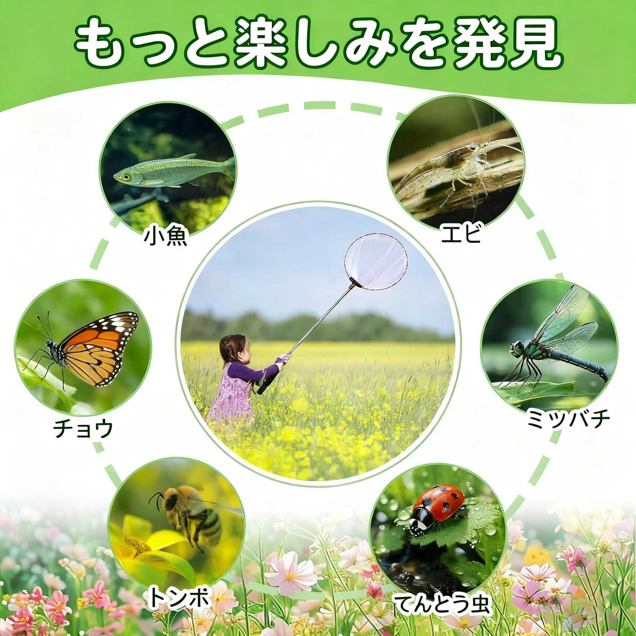 むしとりあみ 子供でも組み立て簡単 持ち運び・収納便利 工具不要で即座に組み立て完了! 収縮時は約 40cm とコンパクトなため、バッグやカバンに収めてハイキング、キャンプ、学校の遠足などに持ち出せます。収納スペースも節約でき、家庭での保管にも便利です。