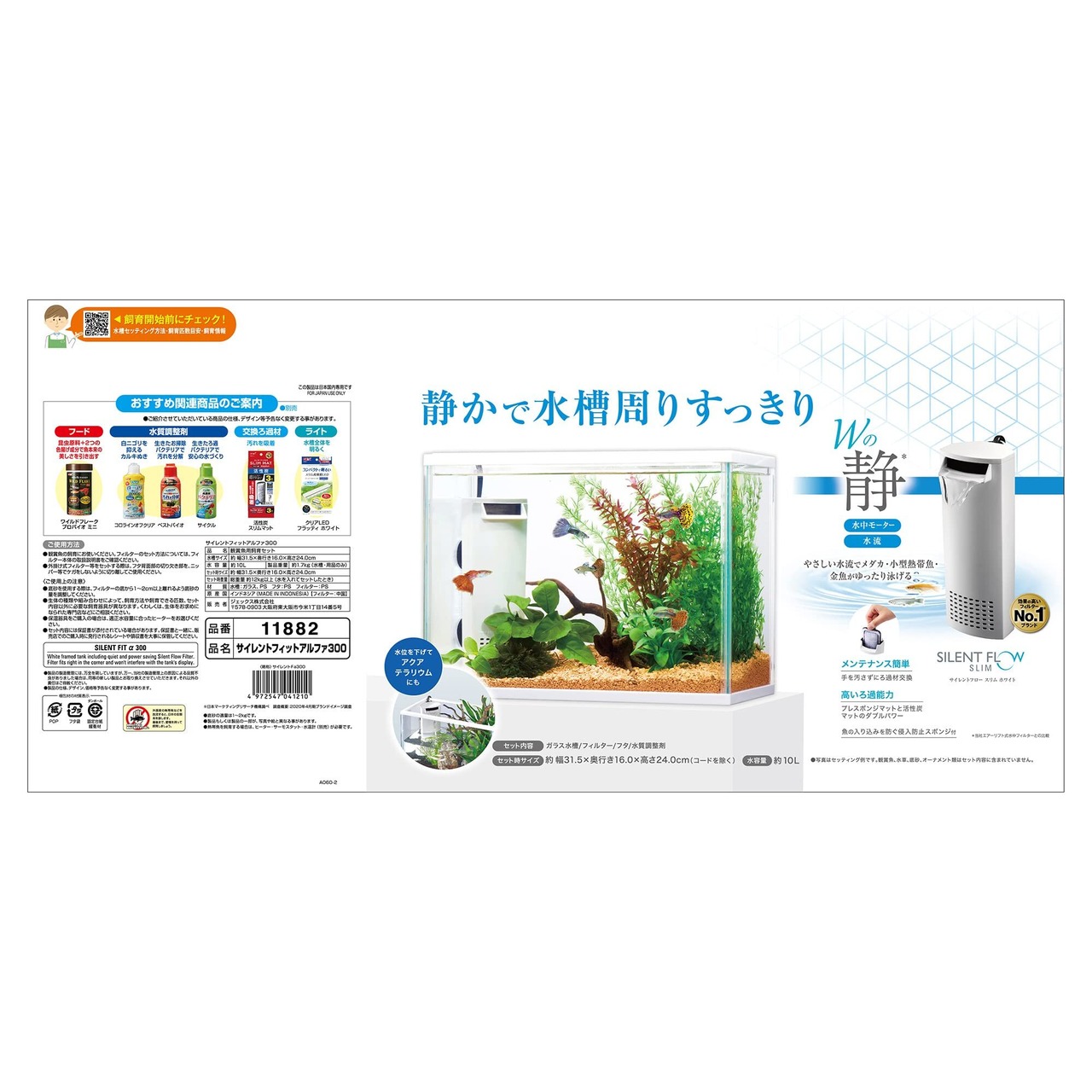 ホワイトフレームと透明感のあるガラスの組み合わせの、手軽なインテリア感のある水槽セット。 音と水流がWで静かな、ハイブリッドフィルター『サイレントフロースリム ホワイト』をセット。