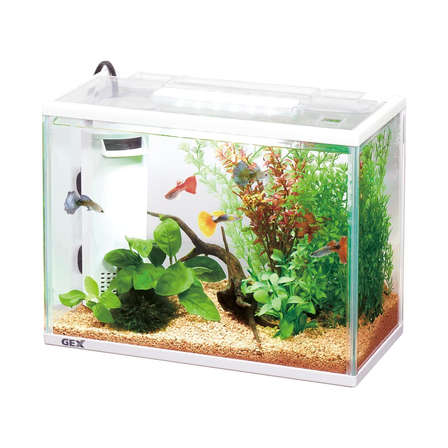 置く場所を選ばない幅30cmサイズのガラス製水槽セット。ホワイトフレームと透明感のあるガラスの組み合わせの、手軽なインテリア感のある水槽セット。