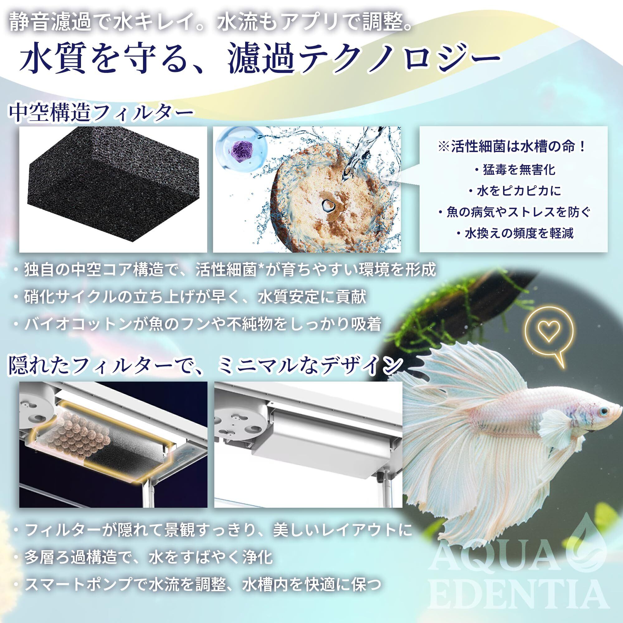 【濾過&循環システム一体型】 底部に静音ポンプ+濾過フィルターを内蔵し、水を常にきれいに保ちます。 初心者でも簡単にクリアな水質を維持でき、メンテナンスも手軽。 水の流れを穏やかにする構造で、ベタや金魚、メダカなどにも最適。