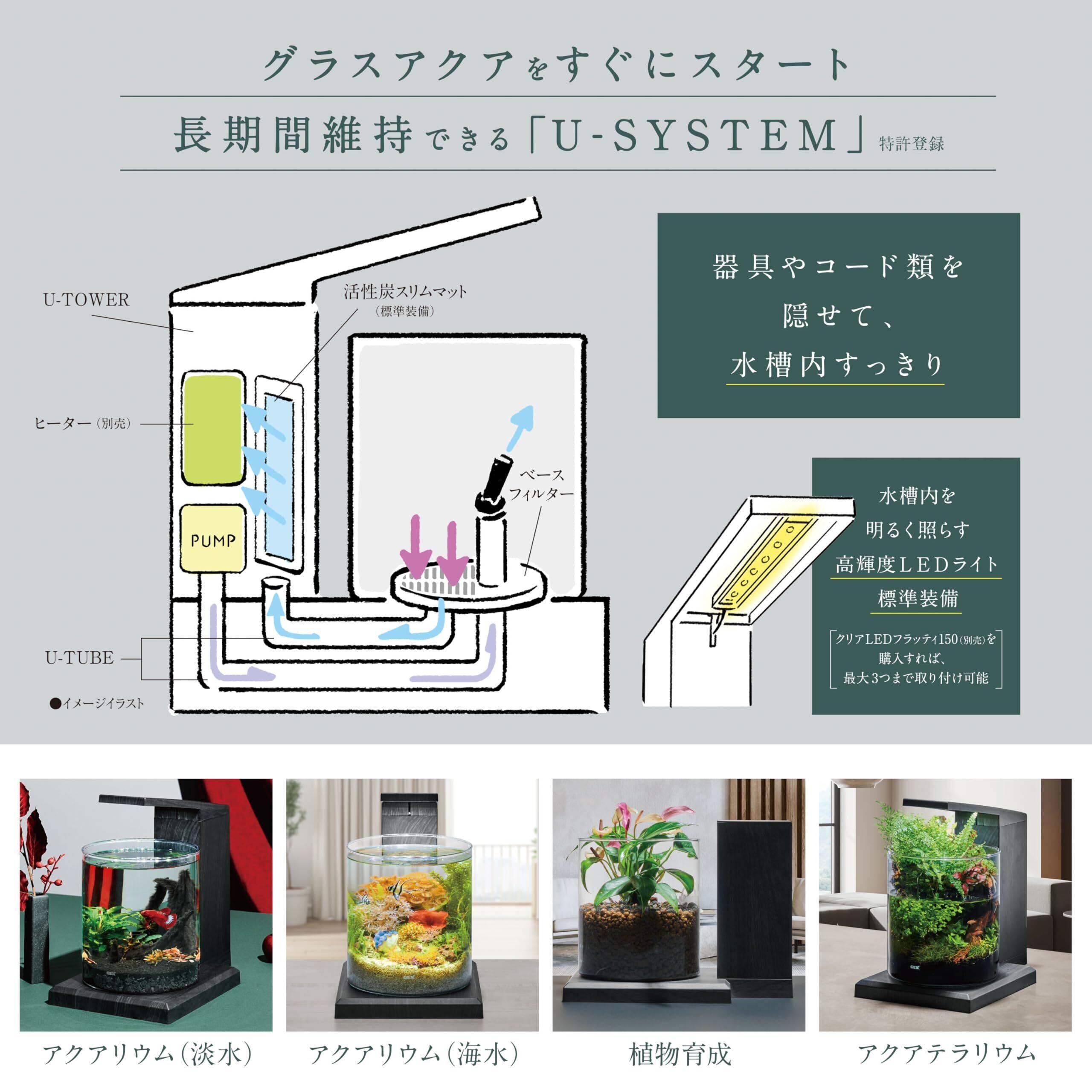 お部屋に素敵なインテリア空間を! グラスアクアをすぐにスタートできるオールインワン水槽セット。 U-SYSTEM採用で器具やコード類をすっきり隠せて、水槽内すっきり。 【アダプターは別売です】。水槽内を明るく照らす高輝度LEDライト標準装備!クリアLEDフラッティ(別売)を購入すれば最大3つまで取り付け可能!CO2添加などして本格的に水草を育てたい、お部屋のなかで圧倒的な明るさのインテリアとして設置したい、などいろいろな楽しみ方に合わせることが可能です。メンテナンスも簡単、便利! 汚れてきたら、レイアウトを崩さず、U-TOWERから水換えができる!レイアウト水槽内を触らずに水抜き、水換えができるのでお魚にもやさしい。テラリウムを楽しむ! 水位を落とした楽しみ方もOK。底面ろ過を優先することで、U-TOWER内の低水位によるろ過効率ダウンを補うことができます。 背が高いテラリウムや植物育成がしたい場合はLEDを外しても使えるろ過槽用フタも付属。<水槽サイズ>:約幅18×奥行18×高さ20cm 、<水容量>:約6L(ろ過槽含む) 、<製品重量>:約1.8kg(水槽・用品含む) 、<セット時サイズ(LED含む)>:幅20.5×奥行33×高さ31.5cm ※本製品にはUSBアダプターは付属していません。LED、ポンプに各DC5V 1A以上のUSBアダプターが必要です。当社純正品(USBアダプター G-1A×2個/G-3.6A・3ポート×1個)もしくは市販のUSBアダプター(DC5V 1A以上)をお買い求めください。