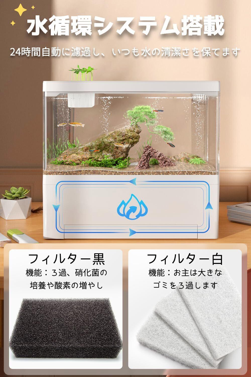 水槽 セット 小型 アクアリウム【インボイス制度登録店】メダカ飼育水槽 フルセット 静音 USB式で省エネ LEDライト付 底部濾過システム搭載 フィルター付 初心者にやさしい ベタ/金魚/熱帯魚 卓上用 取扱説明書付(ホワイト,L)