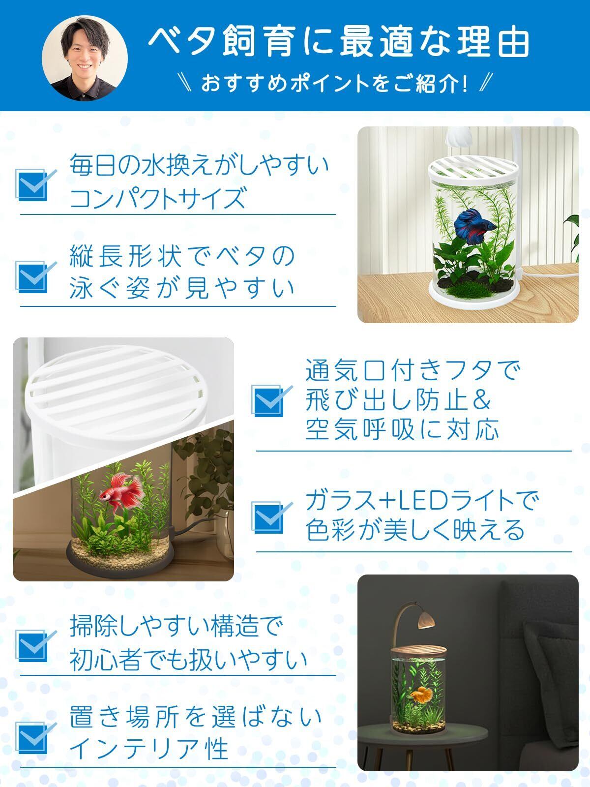 【アクアリスト監修】 ベタ 水槽 ガラス製 (直径10cm×高さ15cm) LEDライト付き 『初心者でも始めやすいセット』