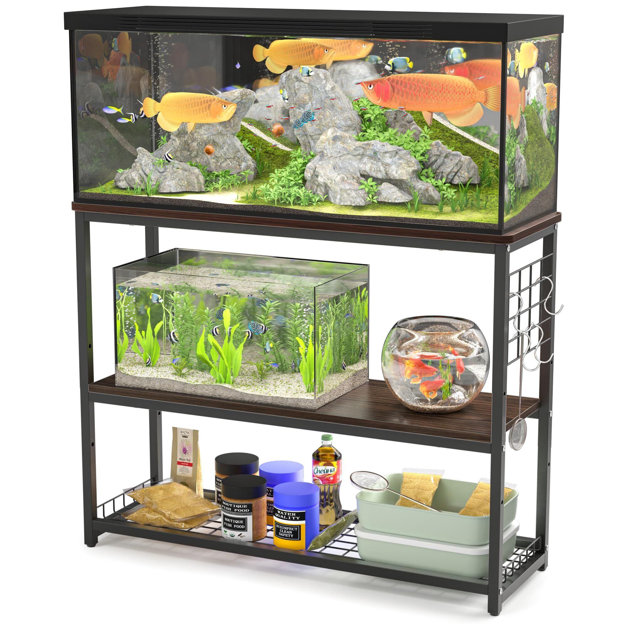 DEWEL 水槽台 幅90cm 棚 スタンド 90センチ水槽台 中棚板高さ調整 ラック ウッドデコスタンド 90cm 台 三段式 フック付き 総耐荷重約120kg 頑丈 シェルフ アジャスター付き 奥行き30cm×高さ70cm ウォールナット