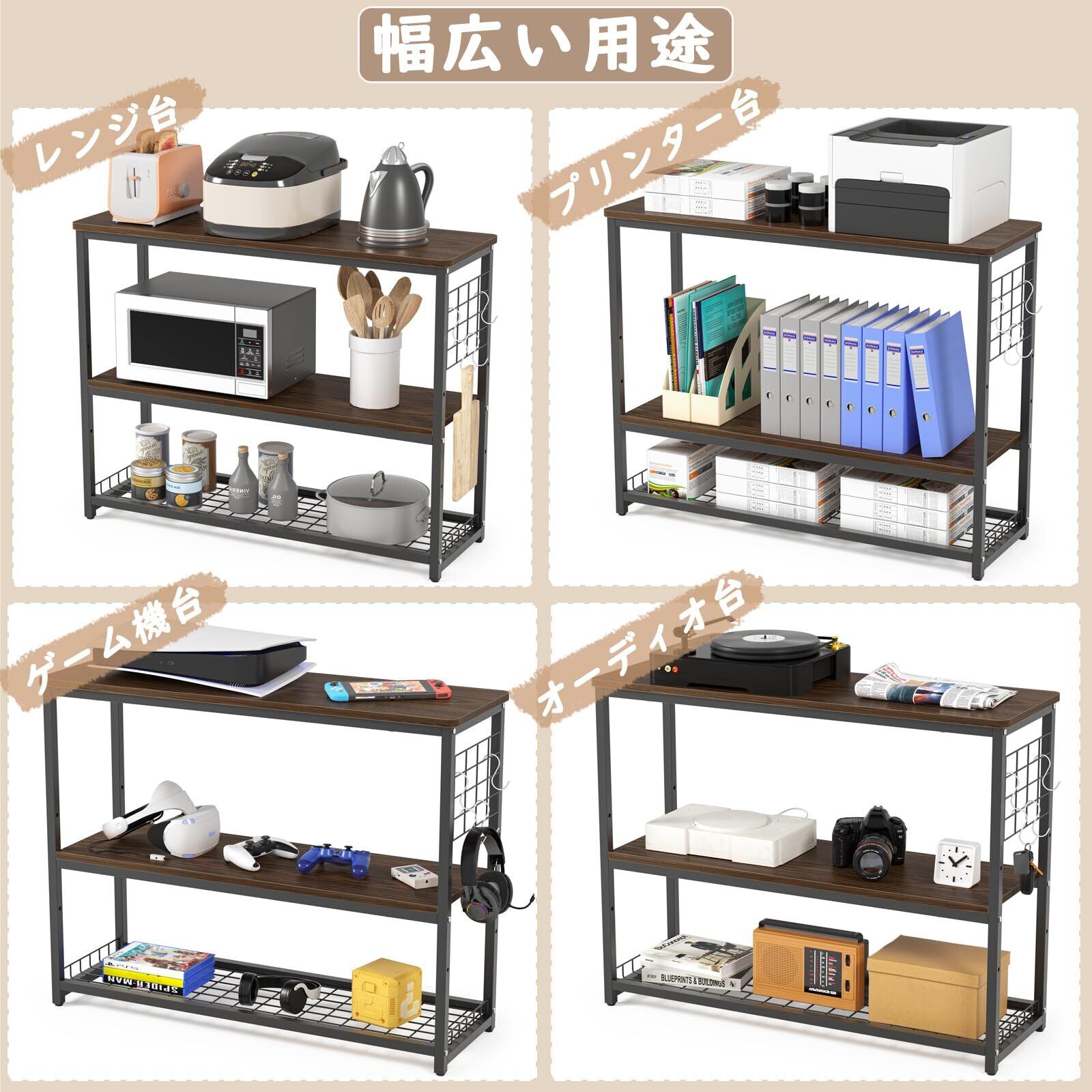【頑丈なメラミン化粧板なので多用途な水槽棚】この水槽 台の天板や棚板の表面には、熱や摩擦による傷、汚れに強いメラミン化粧板を採用するほか、天板中身はパーティクルボード(※特徴:木材のチップを加熱圧縮した板でエコ。材質が均一なので、反り·割れ·狂いが少ない、MDFよりも強度を持たせやすい)なので、長くお使いいただけます。水槽の収納はもちろん、オフィス、書斎、寝室、キッチンやリビングなどで生活用品や事務用品を収納こともできます。!様々な場所で活躍!