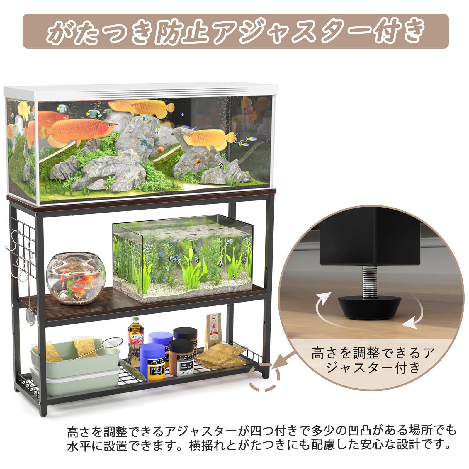 【フック·アジャスター付き】◆この水槽台 90cmは四つの金属フックが付属しており、ラックの側面に漁網、雑布、ブラシなどをフックに掛けて簡単に取り出すことができ、濡れたものも早く乾燥して異味を防ぎます。◆四つのアジャスターが付き、多少の凹凸がある場所でも水平に設置できます。横揺れとがたつきにも配慮した安心設計です。