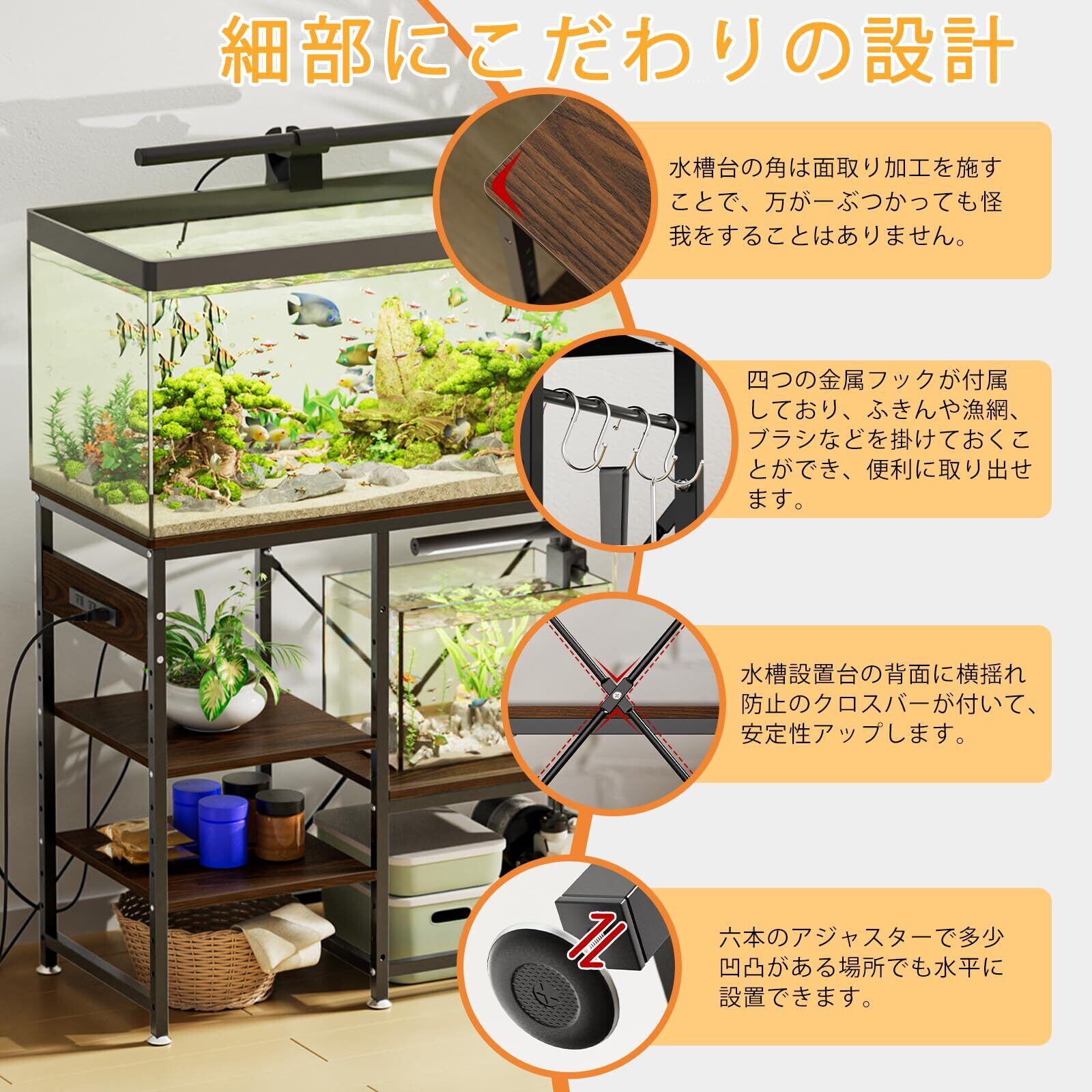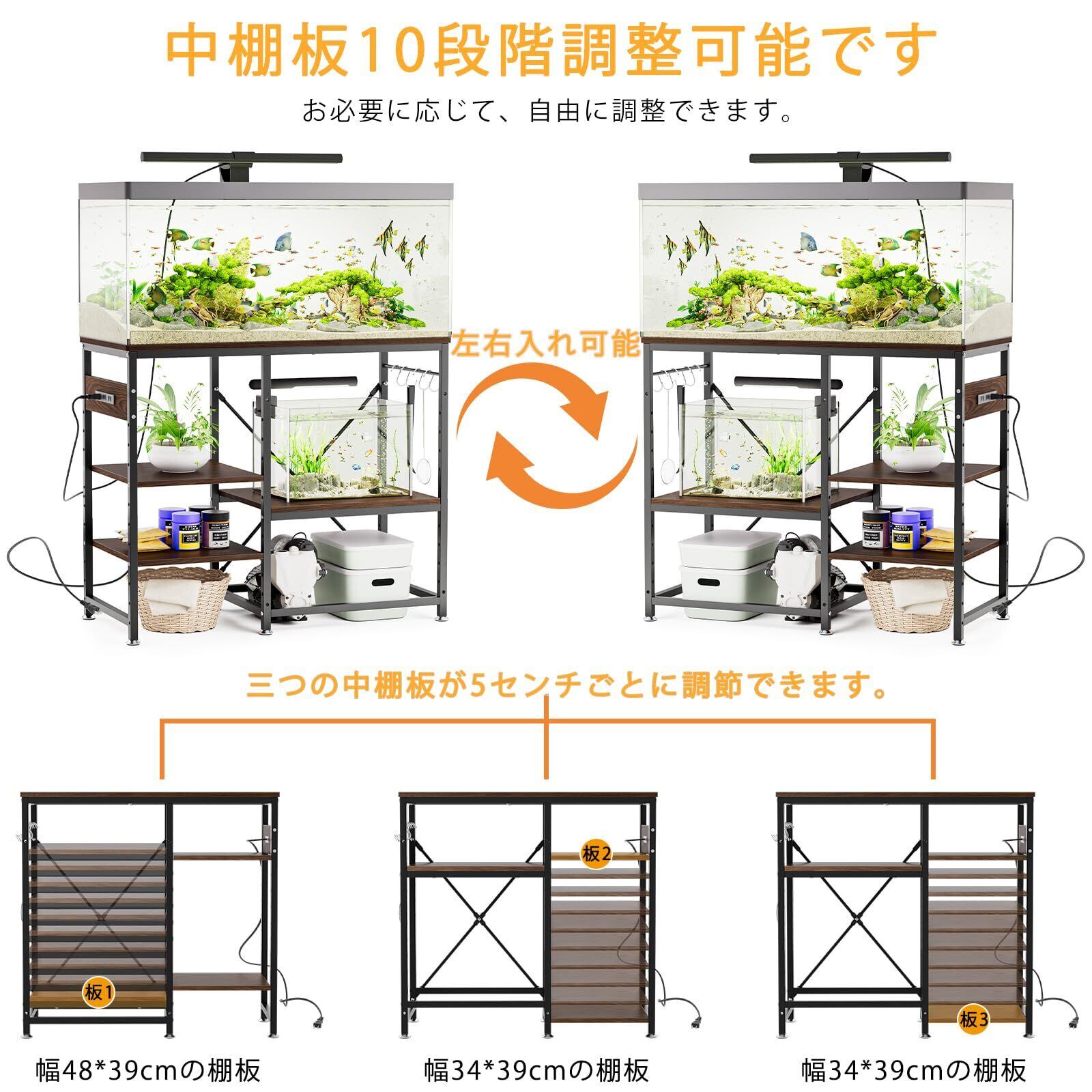 【中棚板高さ調整可能】水槽設置台の中棚板が可動で、収納する物品のサイズに合わせて棚板の高さは5センチごとに10段階で調節可能です。三つの中棚板が水槽、魚の餌、漁網、水槽ブラシ、水槽ライト、ポットなどを棚板に自由に置くことができます。実用性と美観を備えてラックの収納能力を最大限に利用し、周りに必要な物をまとめて収納して効率もアップします。