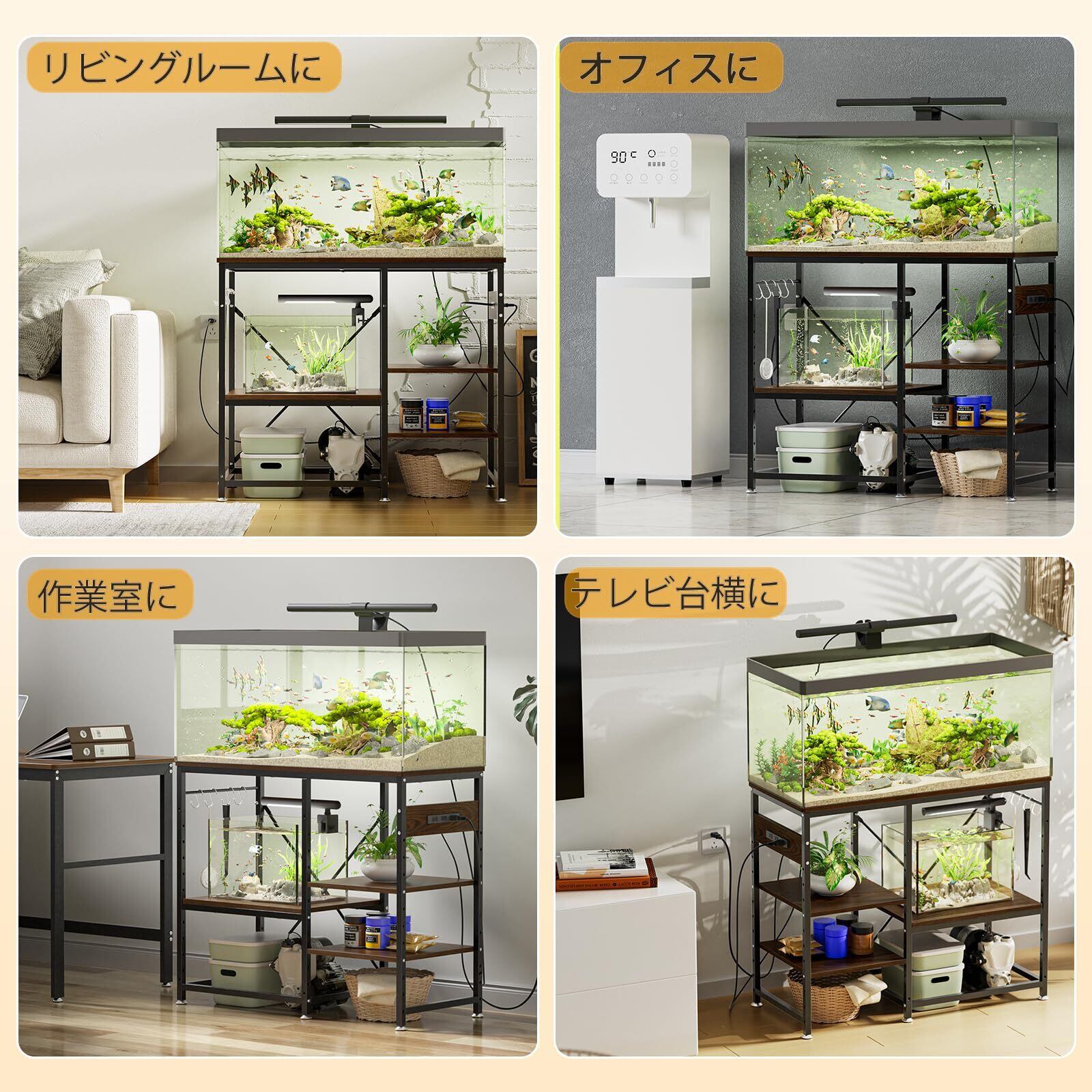 【左右に取り替えがきく】水槽スタンドはお部屋のレイアウト・デザインに合わせて左右に棚を調整することができます。作業室、オフィス、リビングルームなど様々な場所に、お好みに応じて水槽台を設置できます。