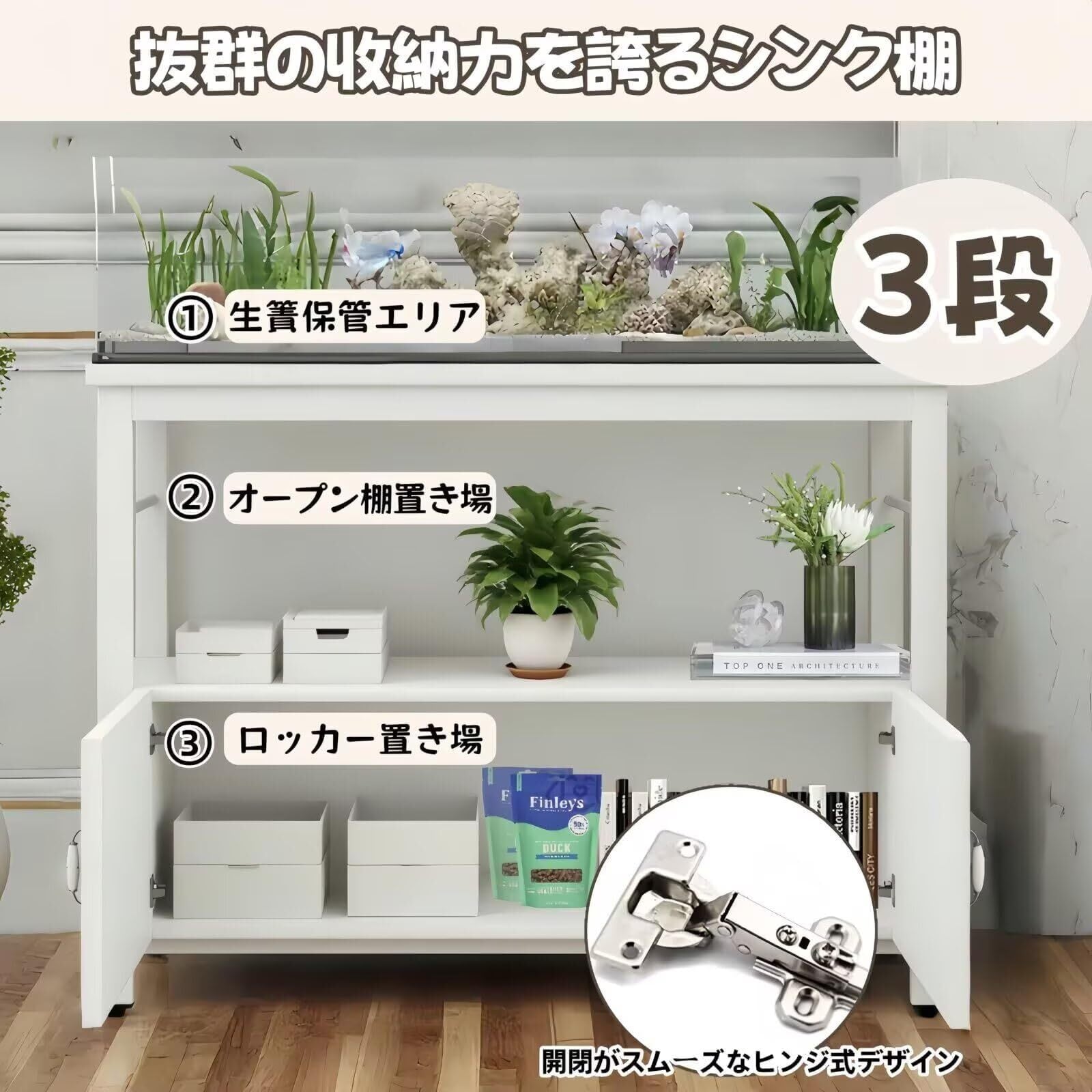 【抜群の収納力を誇るシンク棚】この水槽 ラックは収納空間がたっぷりで、上段と中棚に水槽、下棚には魚の餌、漁網、水槽ブラシなどを自由に収納できます。ろ材、餌、掃除道具などをすっきりと整理・収納し、理想的なアクアリウム環境を作り出します。