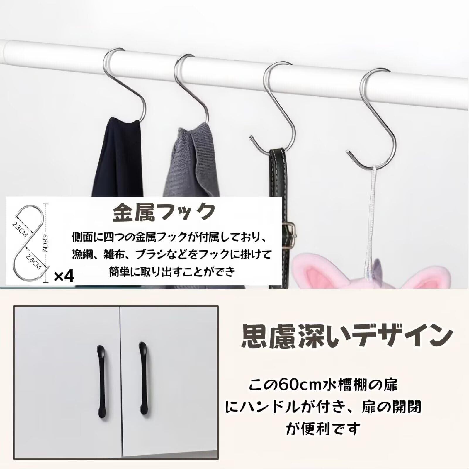 【思慮深いデザイン】この60cm水槽棚の扉にハンドルが付き、扉の開閉が便利です。側面に四つの金属フックが付属しており、漁網、雑布、ブラシなどをフックに掛けて簡単に取り出すことができ、濡れたものも早く乾燥して異味を防ぎます。