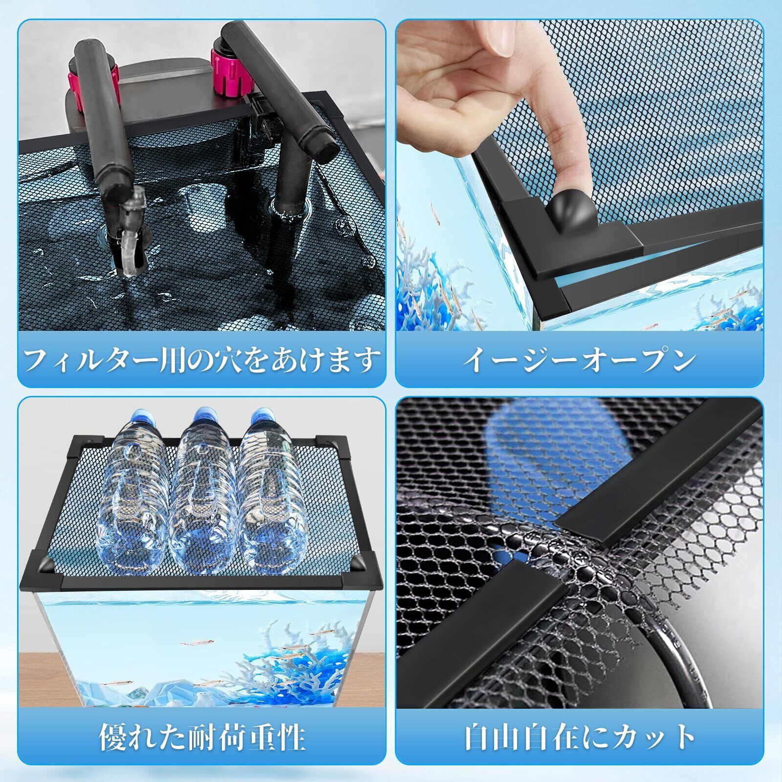 特徴 魚が水槽から飛び出すのを防ぎ、爬虫類のペットが逃げるのを防ぎます