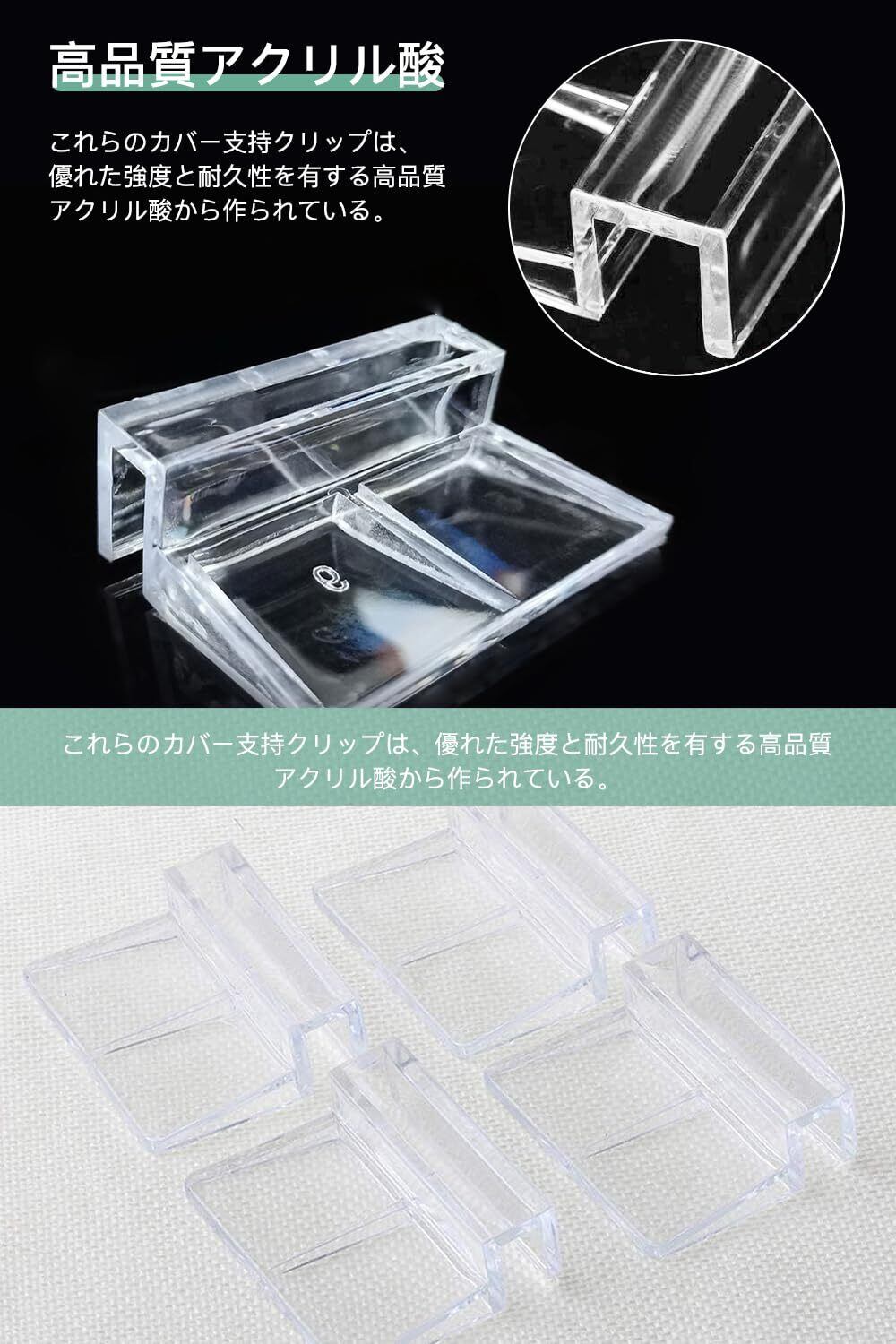 【高品質アクリル酸】これらのカバー支持クリップは、優れた強度と耐久性を有する高品質アクリル酸から作られている。透き通った表面は、水族館の住民や景観を自由に見ることができ、水中世界を十分に楽しむことができます。透明度が高いため、詳細がすべて表示され、戦車環境の楽しみと観察が強化されます。