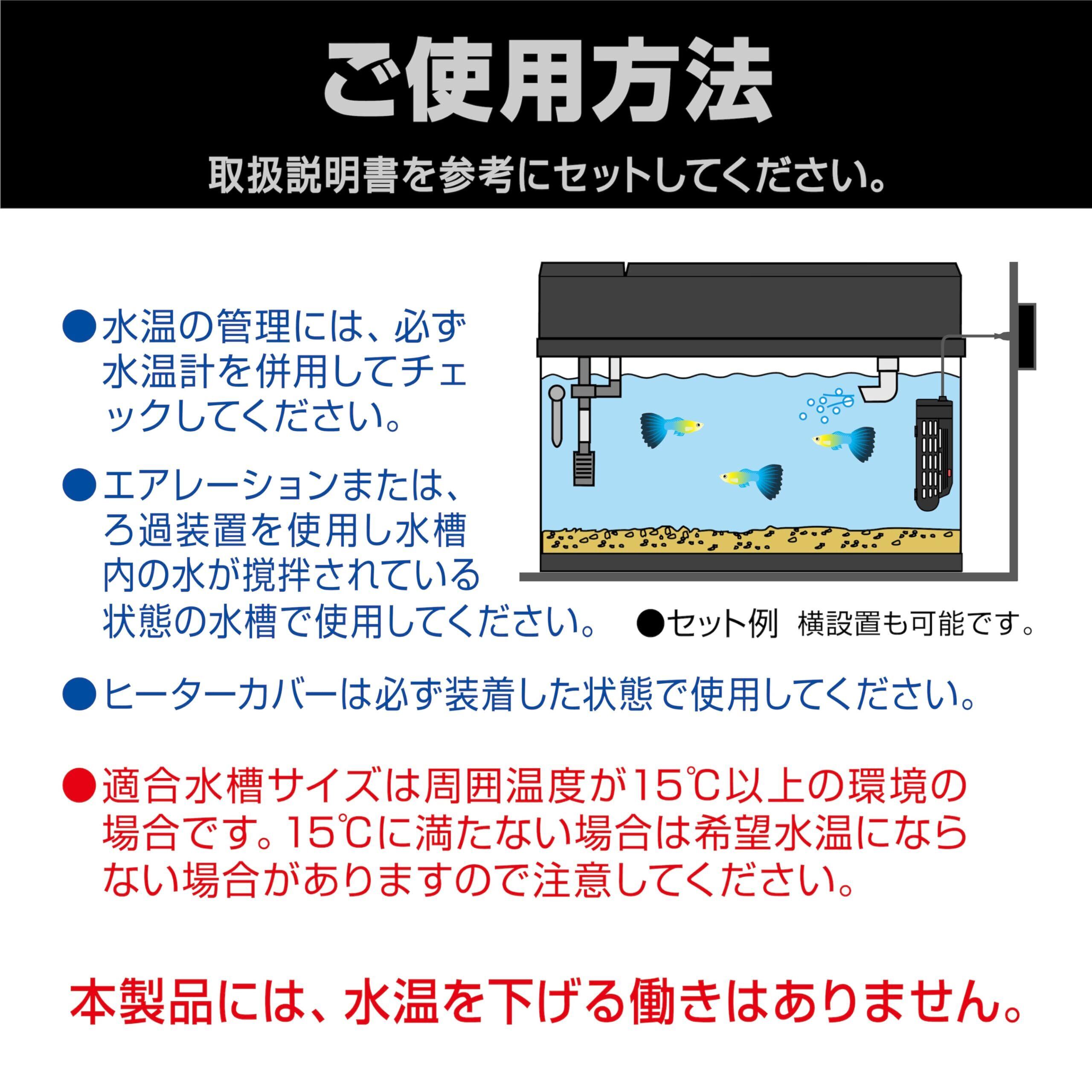 水温の管理には、必ず水温計を併用してチェックしてください ・本製品には、水温を下げる働きはありません ・エアレーション又は、ろ過装置を使用し水槽内の水が撹拌されている状態の水槽で使用してください ・適用水槽サイズは周囲温度が15℃以上の環境の場合です。15℃に満たない場合は希望水温にならない場合があります