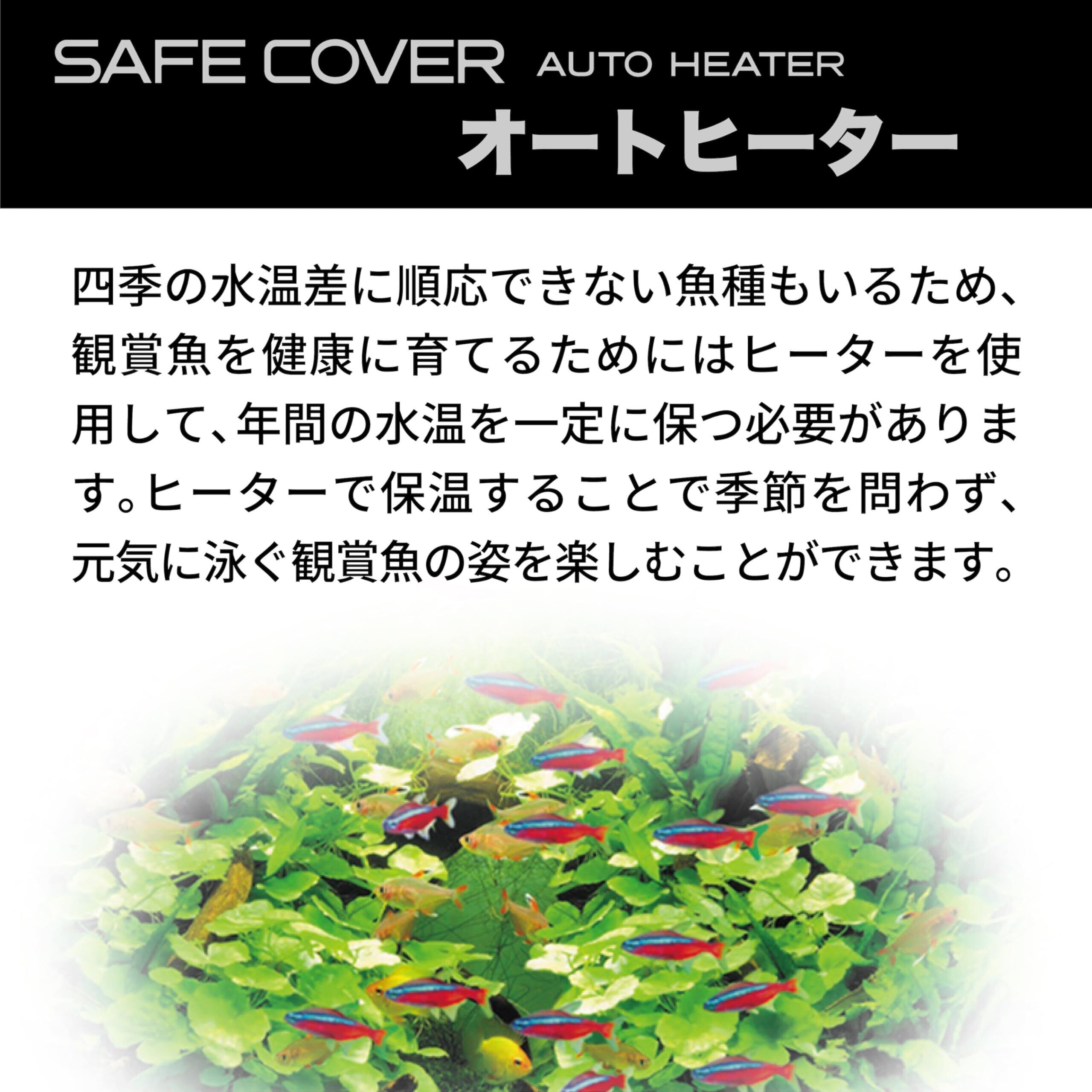 【安全カバー付き】難燃性樹脂を使用したヒーターカバーがついているので、人にも、魚にも安全です。